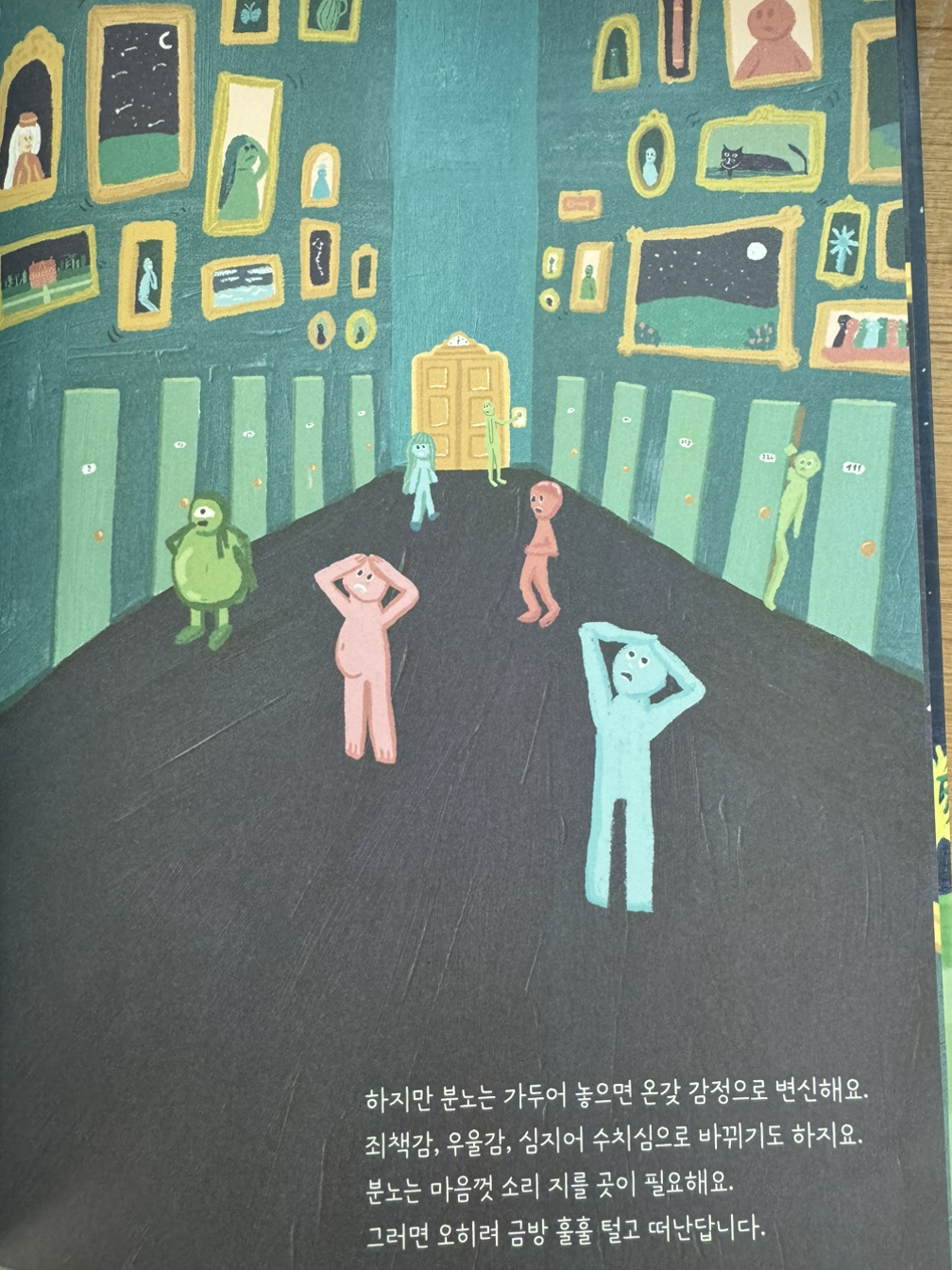 마음일기 검사 후, 아이들에게 감정을 다룬 이야기인 '감정호텔'이라는 그림책을 읽어주었다. 내용은 나 자신은 감정호텔의 지배인이고, 내 속엔 마치 호텔방 처럼 각자 다른 크기와 위치에 살고 있는 다양한 감정이 존재해있다고. 슬픔은 조용히 기다려주어야 하고, 분노는 누구도 볼 수 없는 작은 골방이 아닌,그것을 분출할 수 있는 큰 방을 내어주어야 한다고. 일기장에 마음을 털어놓은 아이들에게 해준 내 댓글과도 닿아있는 말들이었다. 슬픔 분노와 같은 부정적인 감정은 누구도 보이지 않는 곳에 꼭꼭 숨겨두지만 말고 조금씩 표현도 하고, 그것이 지나가길 가만히 기다려주자는 말.