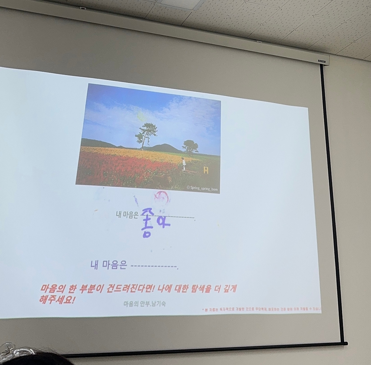 그림책 한권을 다 읽은 후 강사님은 “최근 내 마음을 들여다본 적이 있나요? ”내가 몰랐던 의외의 모습에 놀랐던 적이 있나요?“ 두 질문을 차례로 물으셨다. 마치 내 마음에 안부를 물어주는 듯 다정한 목소리에 꽁꽁 닫혀있던 마음의 걸쇠가 스르륵 풀렸다. 모두가 같은 마음인지 나를 비롯한 다른 학인들은 연필을 들어 그 질문이 적힌 종이에 진심을 담아 꼭꼭 적어나갔다.