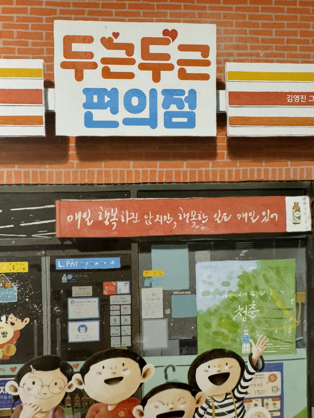 책의 앞표지에서 가장 먼저,그리고 제일 오래 눈길이 간 문구다. 그림체도 사실적인데다 우리 집 남매들이 좋아하는 편의점을 주배경으로 한 그림책이라 도서관서가에서 주저 앉고 빼들어왔다.