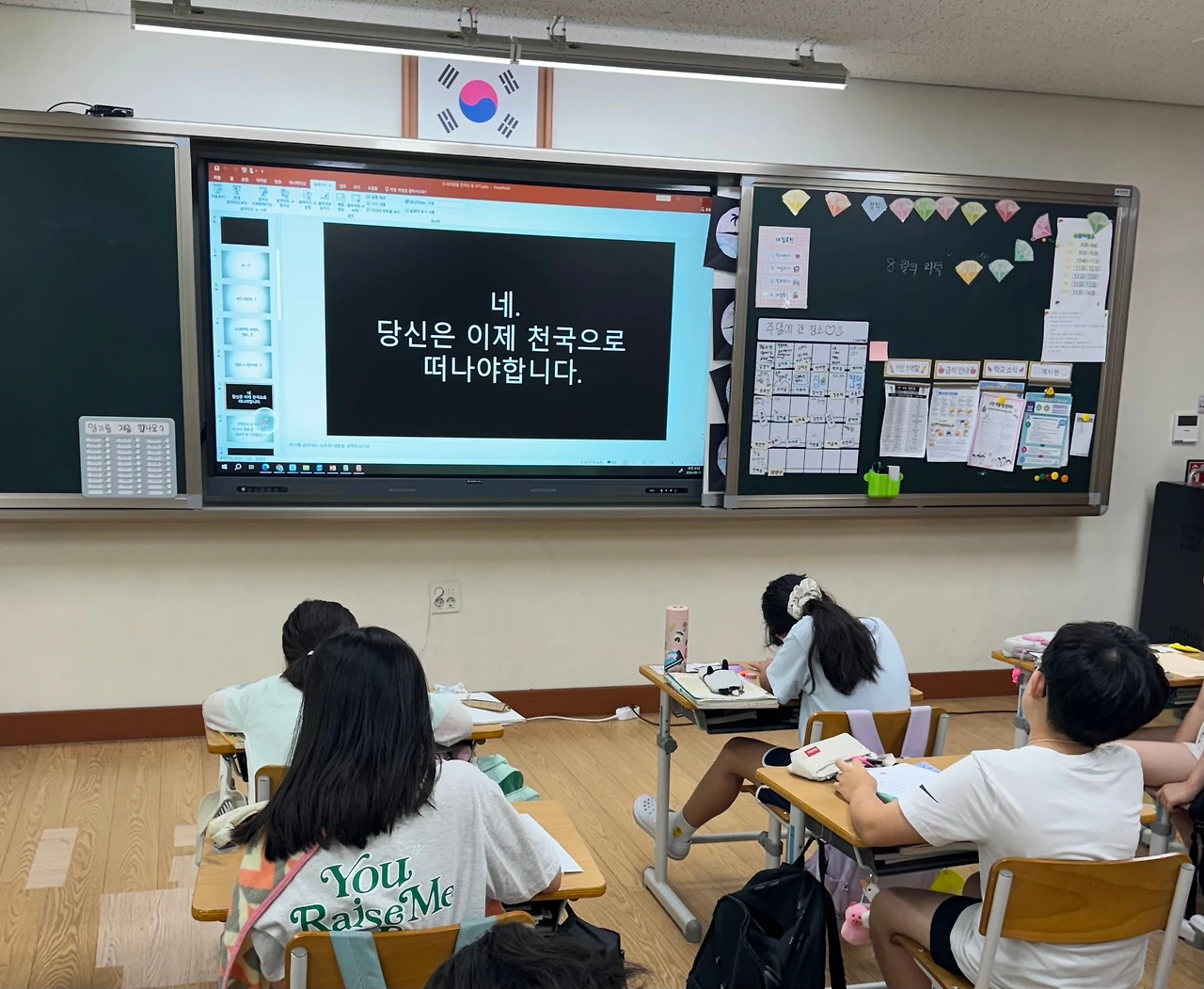 아들을 향한 절절한 마음이 아이들에게도 가닿았는지 교실 여기저기서 훌쩍이는 울음소리가 들려왔다. 마지막 마무리, 엄마가 없어도 지금처럼 씩씩한 아들로 자라고 엄마는 천국에서 아들이 꿈을 이루는 순간까지 응원할 것이며 다시 태어나도 엄마 아들로 태어나달라,사랑한다는 말을 끝으로 편지를 마무리했다. 그 순간 교실의 공기는 묘하게 바뀌었고 나포함 26명의 아이들은 모두 천국으로 가는 배에 함께 오른 동지가 되었다.