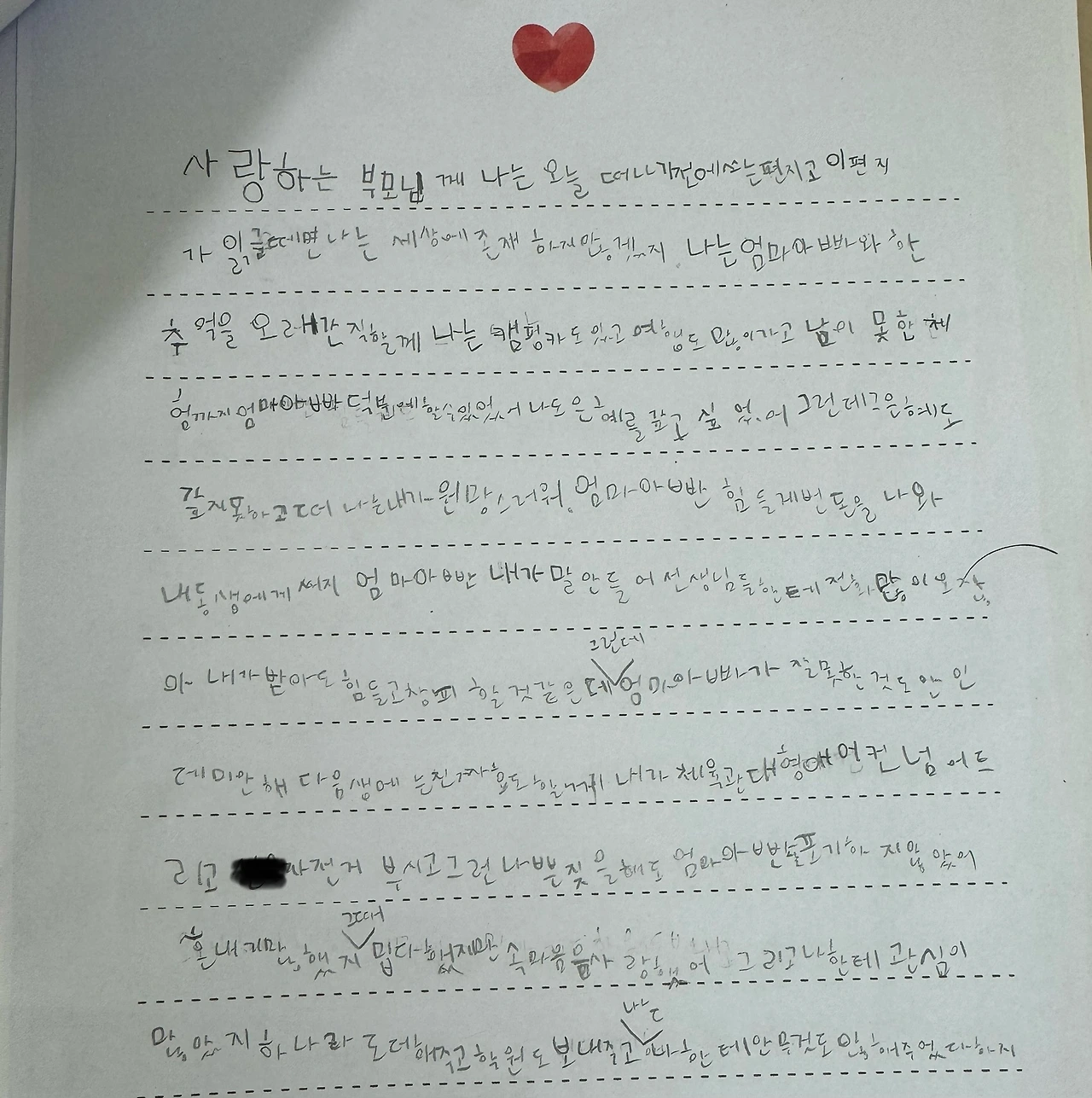 사랑하는 부모님께로 시작한 아이의 편지. 오늘 떠나는 날까지 사고만 치고 가서 미안하다는 말이 입밖에서 흘러나오자 아이들과 내 눈빛이 일제히 아련해지기 시작한다. 얼마 전 친구의 자전거를 부시고, 체육관의 에어컨을 넘어뜨리는 그런 나쁜 짓을 해도 부모님은 나를 포기 하지 않고 혼내주어 감사하다. 그리고 선생님들한테 전화를 많이 받게 했는데 자신이라면 힘들고 창피할 것 같다며 엄마아빠 잘못도 아닌데 그런 일을 겪게 해서 미안하다고, 그리고 엄마가 혼낼 때 마다 밉다고 했지만 속마음은 사랑했다고. 효도 못하고 가서 미안하고 다음생에는 착한 아들로 태어나 효도 많이 하겠다며 편지를 마무리했다.