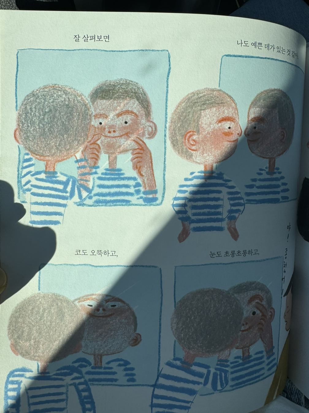 책의 주인공도 친구에게 우연히 들은 예쁘다는 말로 인해 자신을 다시 보게 된다. 전까지는 별 생각 없던 자신의 얼굴을 거울로 자세히 뜯어보며 괜스레 미소짓기도 하고, 누군가의 예쁘다의 말로 한순간에 자신이 예쁜 사람으로 수직상승한 기분을 맛본다. 그림책 속 남자아이를 보니 나도 작년에 한 선생님과의 점심자리에서 들은 기분좋은 말이 일순 떠올라 절로 미소가 지어진다.