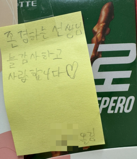 월요일 아침, 무겁게 발걸음을 떼어 교실로 들어왔는데 책상 위에 놓은 빼빼로와 노란색 포스트 잇에 쓰인 메세지를 보고 눈을 의심했다.