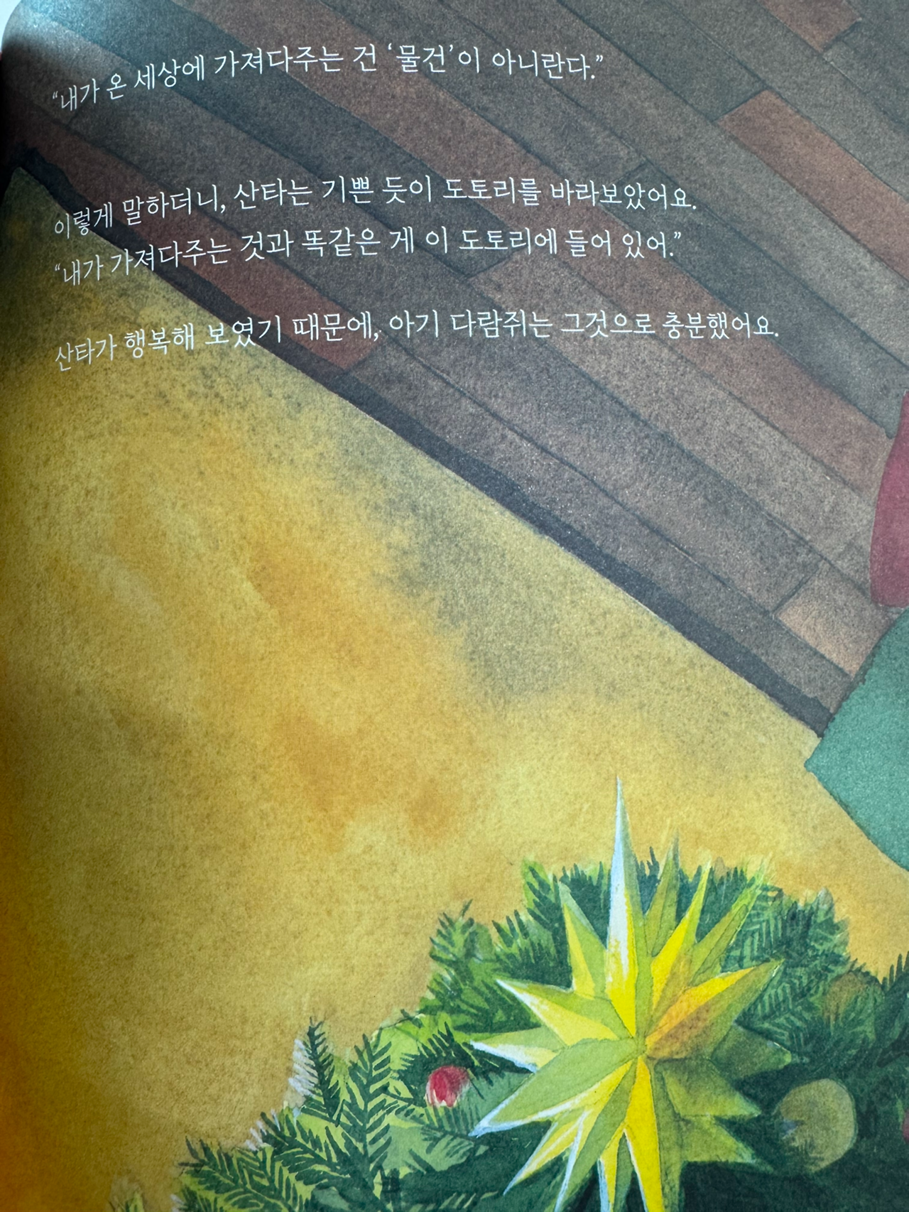 노랗고 따듯한 조명아래 벽난로와 크리스마스 트리가 있는 풍경 속 산타할아버지와 아기다람쥐의 그림체는 보는 이로 하여금 크리스마스의 안온함을 그대로 느끼게 해주는 책이다. 나는 이 책을 읽으며 누군가에게 무언가를 준다는 것. 즉 선물의 진정한 의미에 대해 생각해보게 되었다. 크리스마스를 삼일 앞둔 시점, 크리스마스 트리 옆에 걸어놓은 빨간색 양말 안에 우리 집 첫쨰도 벌써 흰 스케치북 종이에 "산타할아버지 이번엔 과자꾸러미를 선물로 주세요. 엄마아빠 말 잘 듣고 기다리고 있을테니 꼭이요" 라는 깜찍한 메세지를 적어놓았다는 것은 안비밀이다. 크리스마스에 산타할아버지에게 받을 선물을 상상하며 마음 속에 설렘을 품는 건 예나지금이나 변치 않는 사실이다.