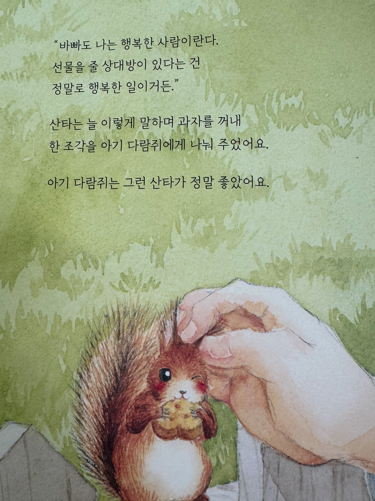 그림책 아기다람쥐의 크리스마스 그림책에 나오는 구절이다. 매해 크리스마스 시즌이 되면 택배아저씨보다 더 바쁜 한 사람. 전 세계 어린이들의 희망 산타할아버지. 그런 산타를 걱정하는 아기 다람쥐에게 세상 친절한 미소를 지어보이며 산타할아버지가 건네는 말이다.