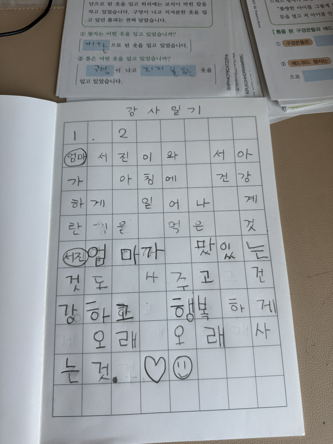 아들은 잠시 머뭇하더니 연필을 꼭 쥐고 무언가를 열심히 써내려간다.