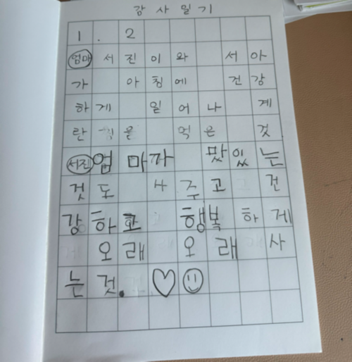 감사의 취지를 조금 이해못한 건지 자신의 새해소망을 써놓았지만 어쨌든 첫 시작이 좋다. 엄마의 건강을 소망해주는 아들이 있음에 나는 또 감사했다. 나의 감사에 아들이 화답하듯 감사하고, 또 그 감사에 또 다른 감사함을 느끼고. 그야말로 감사의 선순환이었다.