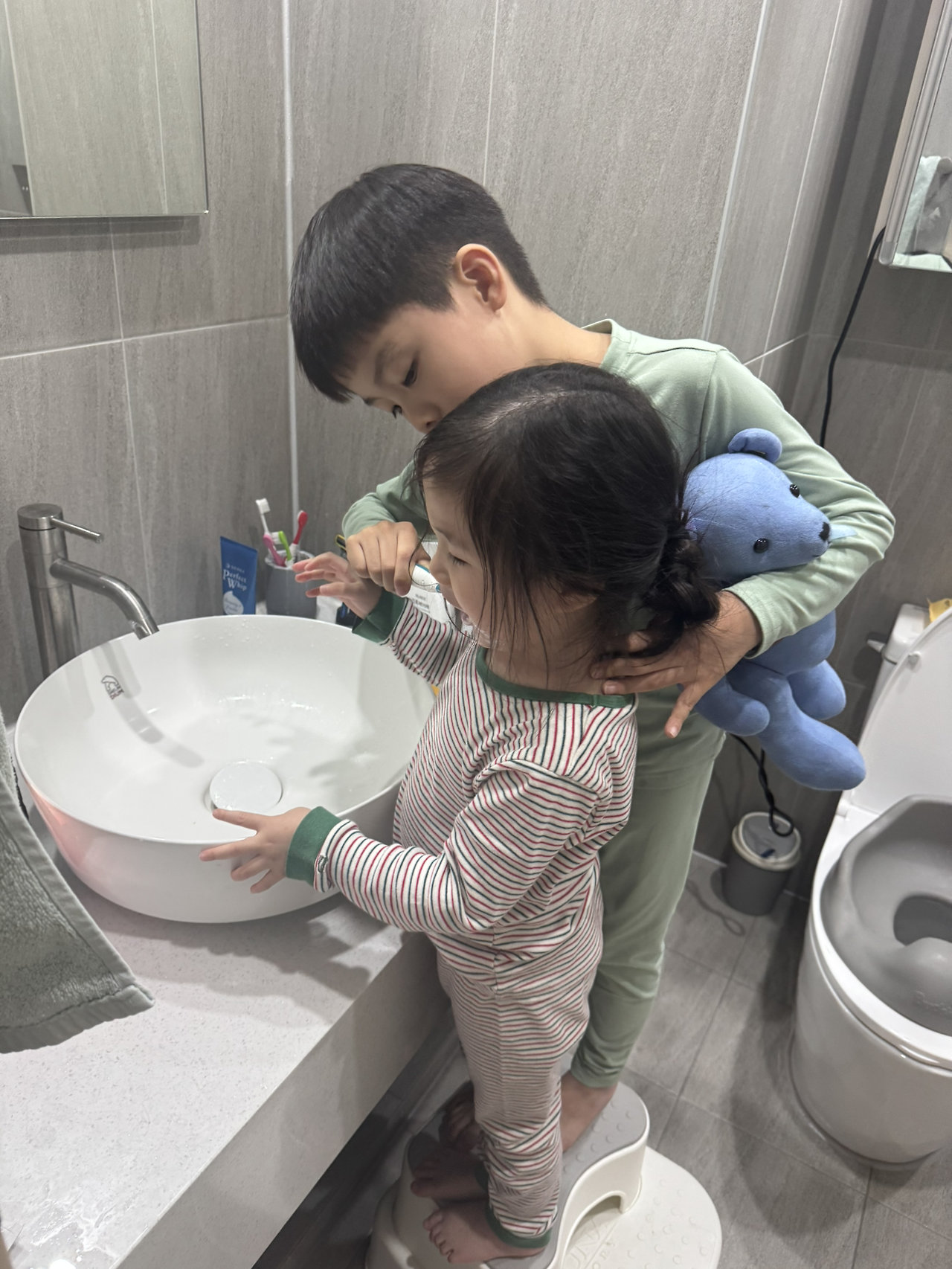 그날 밤, 여느 때와 다름없이 잘 준비를 하려는데 아들딸이 눈에 보이지 않았다. 집안을 이리저리 살펴보니 화장실의 문틈 새로 두 아이의 모습이 눈에 들어왔다. 아이들이 조용하면 늘 불안한 법. 나는 아이들이 대형사고를 치는 것을 어떻게든 막으려는 심산으로 재빨리 문을 열고 들어갔다. 그 순간 내 눈에 들어온 예상치 못한 전개에 잠시 얼어붙고야 말았다. 세상에나 첫째가 둘째 양치를 시켜주고 있는 것이 아닌가. 게다가 세상 다정한 목소리로 00이 잘하고 있어 멋져 라는 따스한 말을 곁들여가며 말이다.