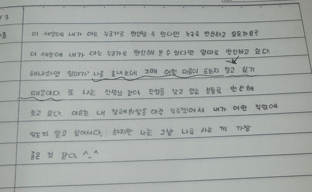 늘상 그래왔듯 주제를 받아들고 미간을 좁혀가며 생각을 쥐어짜낸 뒤 세줄쓰기를 끝낸 아이들이 하나 둘 내게 공책을 내민다. 아이브 장원영,아이언맨, 세계 최고의 부자, 유명 유튜버 등 고 나이때의 아이들이 선망하는 다양한 인물들이 아이들의 공책에 또렷이 적혀있다. 얼척없는 웃음이 나기도 하고 귀엽기도 해서 나도 모르게 입가에 웃음이 난다. 그러던 중 우리 반 유니콘같은 존재인 한 여자아이의 세줄쓰기를 보다 돌연 가슴이 쿵하고 울렸다.