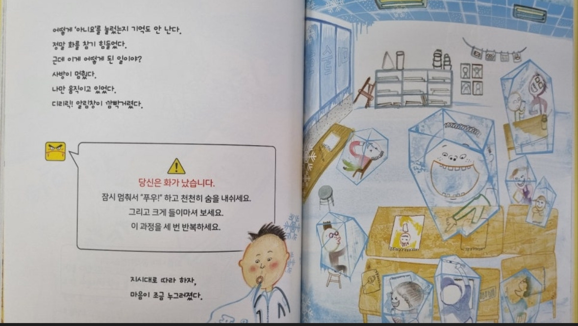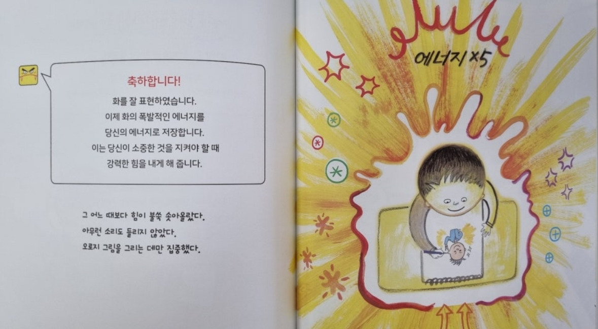 그림책 속에선 앵거게임이라는 앱이 등장한다. 그리고 아이가 화를 내야 할 순간을 마주칠 때 마다 “화를 내며 공격하시겠습니까?”라는 팝업창이 뜬다. 네 라고 누르면 뾰족한 말이 나오고 배터리가 소진된다. 그에 반해 아니오를 누르면 심호흡을 3번 하라고 뜬 뒤 화를 마주하라고 지시한다. 화가 난 이유를 속으로 차분히 생각해본 뒤, 화가 나게 만든 상대에게 자신이 바라는 점을 차분히 말하라고 한다. 화라는 감정을 적절하게 잘 표현했을 경우 격려하는 멘트도 함께 나온다.