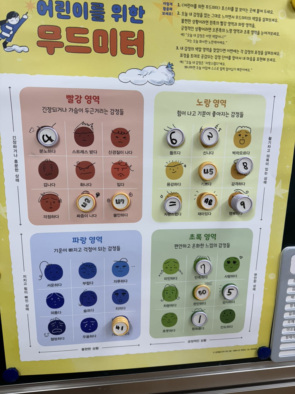 그리고 감정무드미터에 붙은 자석을 보며, 아이에게 질문을 하고 감정을 토로할 수 있는 장을 만들어 줄 수 있으니 작은 종이하나가 갖는 소통의 힘은 실로 큰 것이었다. 이 좋은 무드미터 활동. 마음 속에 부유하며 갈 곳을 잃은 내 감정에 이름을 붙여주고 밖으로 불러내고, 같은 감정끼리 모여 서로의 마음을 나누면서 우리는 아마 매일 한 층 더 성장해갈 것이다.