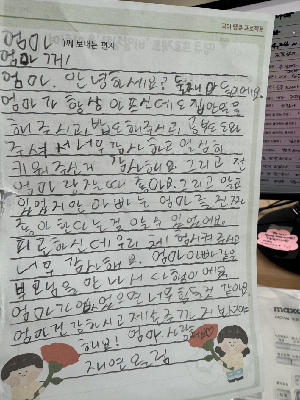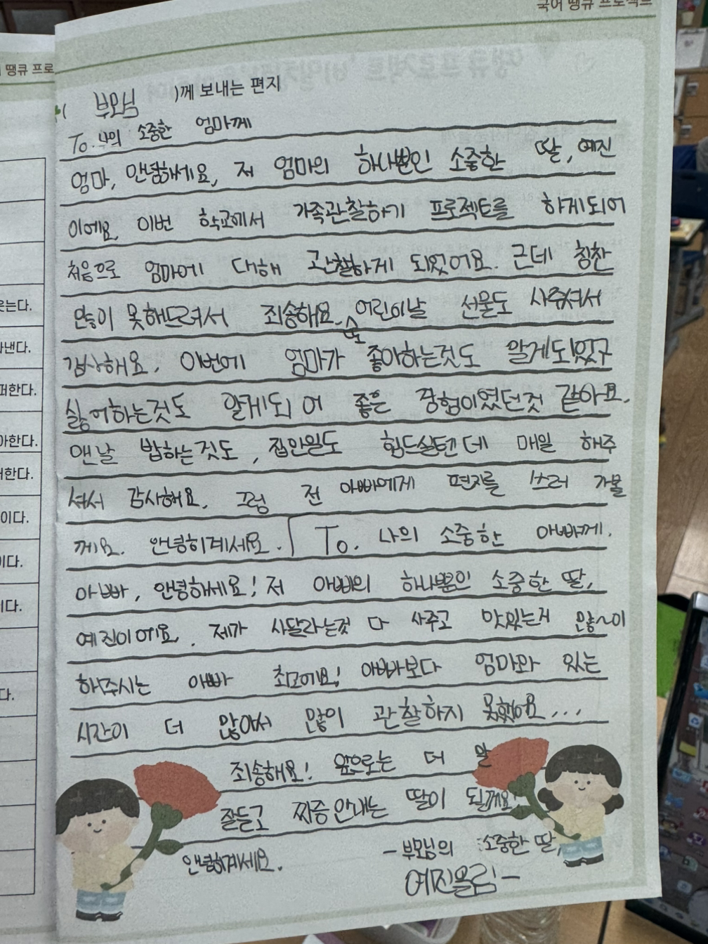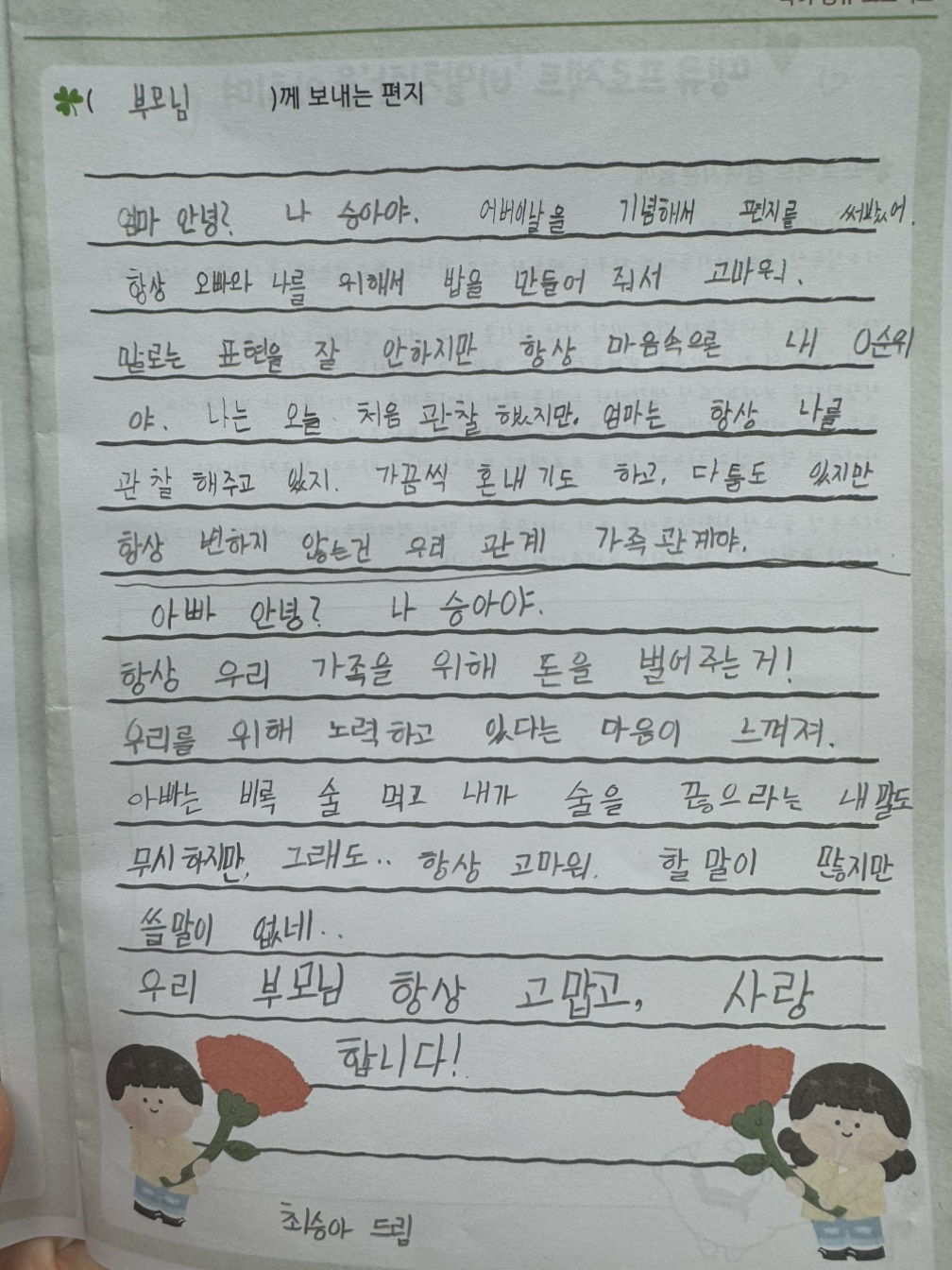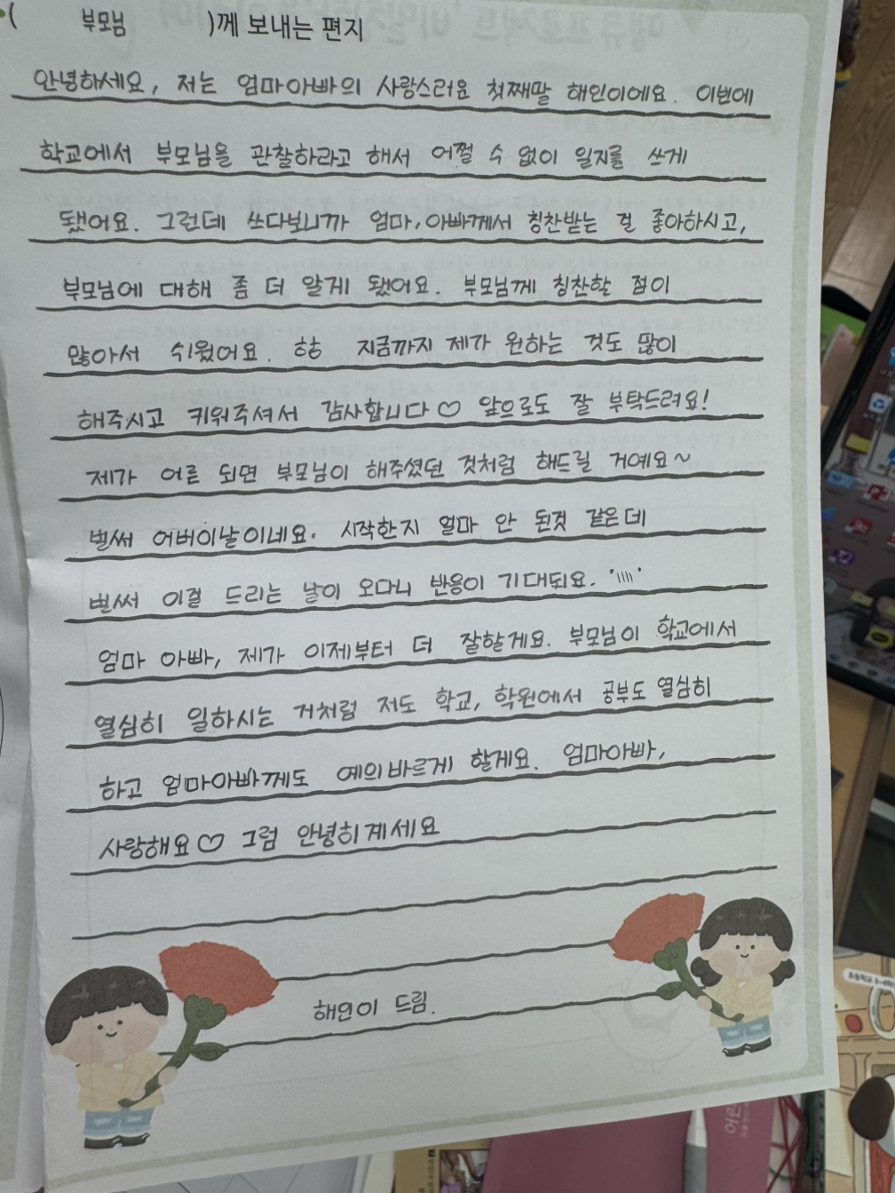 ”그리고 선생님이 엄마로서 솔직히 말해주는 건데 엄마아빠도 아이들에게 받는 거 좋아해. 꼭 비싼 물건이 아니라 진정성있는 감사한 마음 말이야“