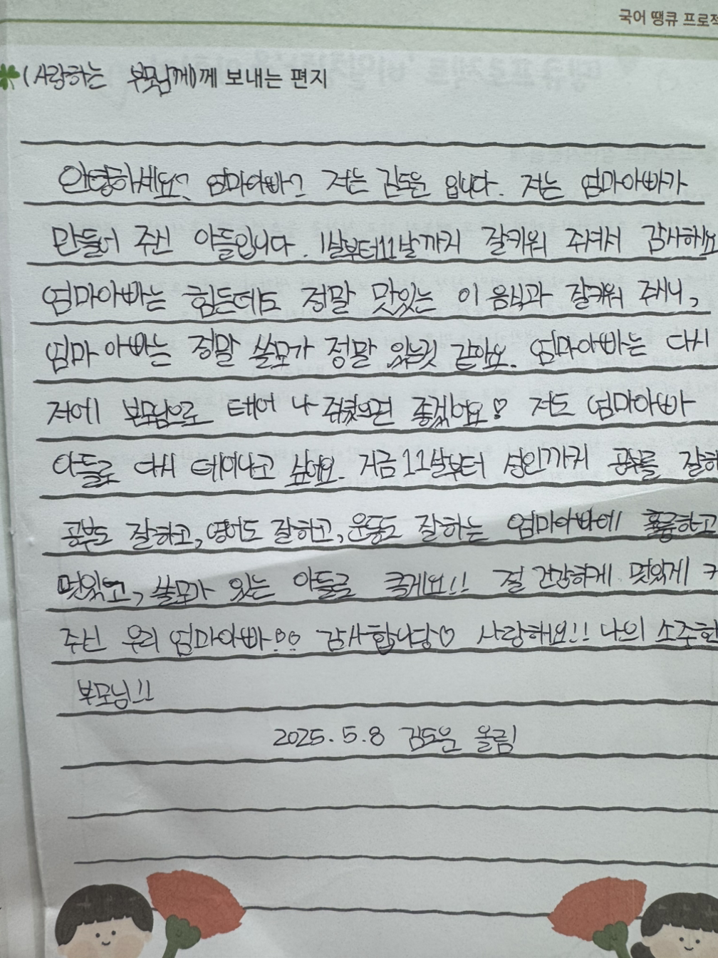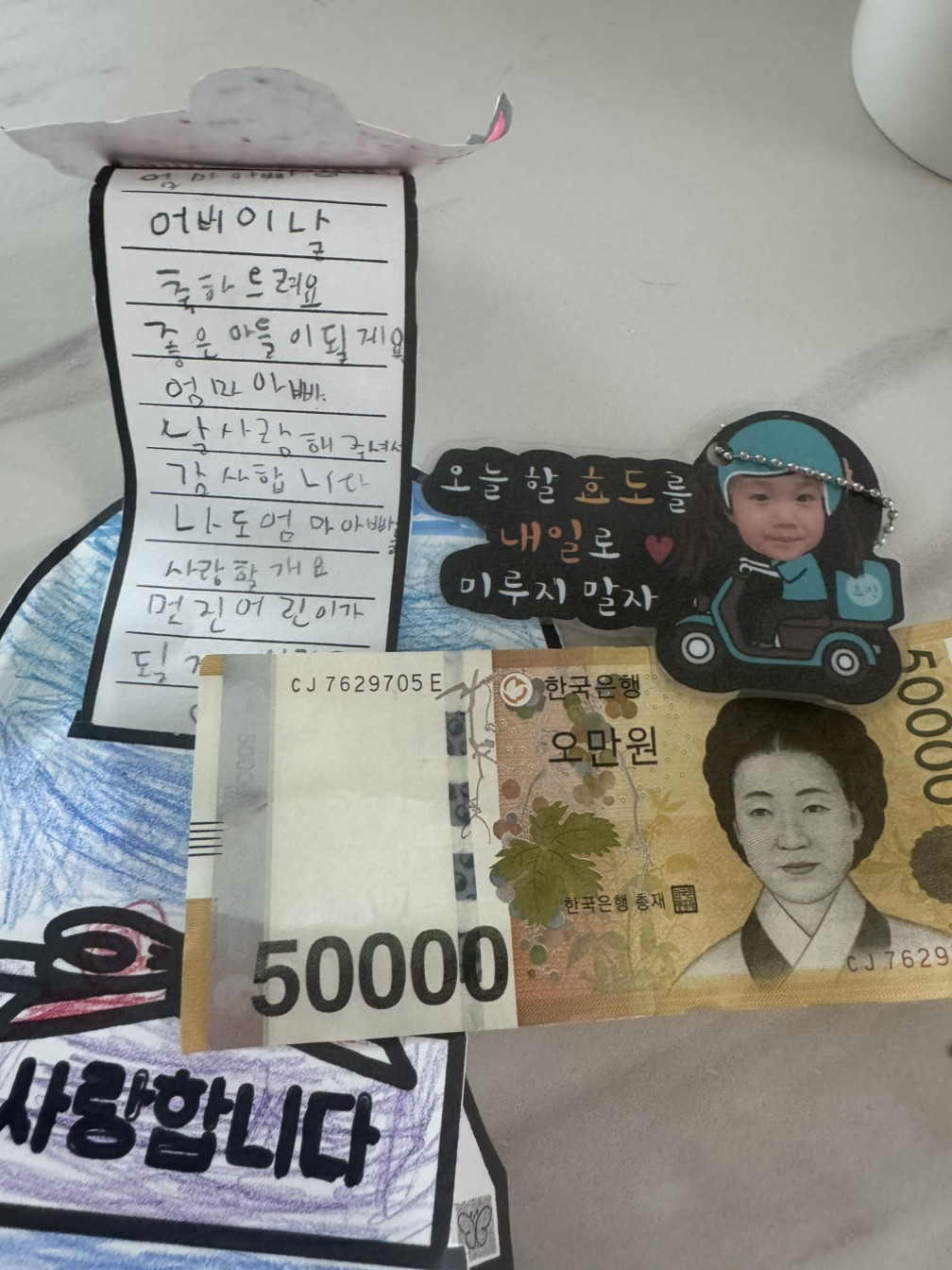 아들은 부스스한 눈을 부비며 신나게 자신의 방으로 달려가더니 내게 5만원권 한장과 전날 학교에서 쓴 어버이날 편지를 건넸다. 나는 아들을 포옥 안아주며 귓가에 달콤하게 고맙다는 말을 해주었다. 아들은 엄마를 기쁘게 했다는 사실에 어깨가 한껏 치솟은 채 등교준비를 시작했다.