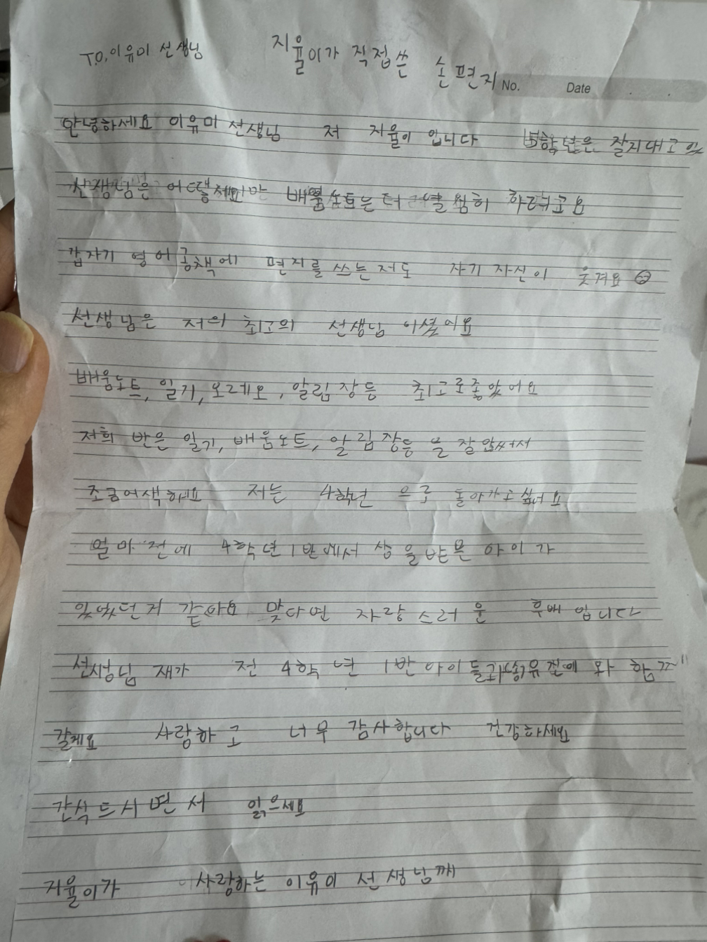 “제가 매일 수학익힘책도 느리게 풀고 미술도 늦게 하는데 선생님이 늘 믿는다 잘할 수 있다 끝까지 책임지는 건 멋지다 라고 얘기해주신 기억이요”