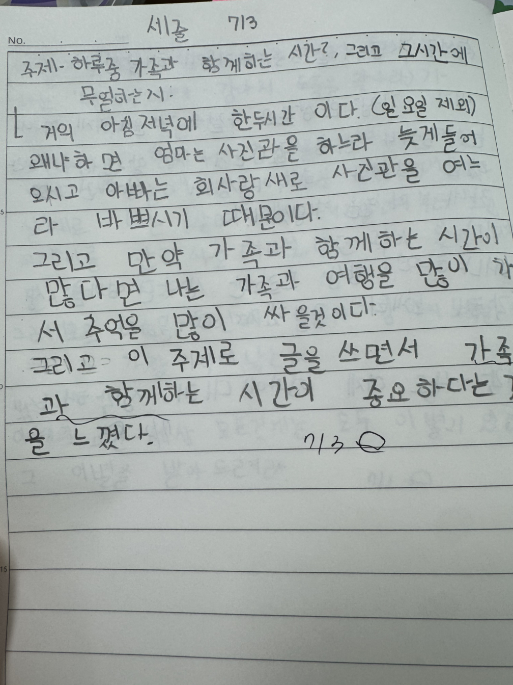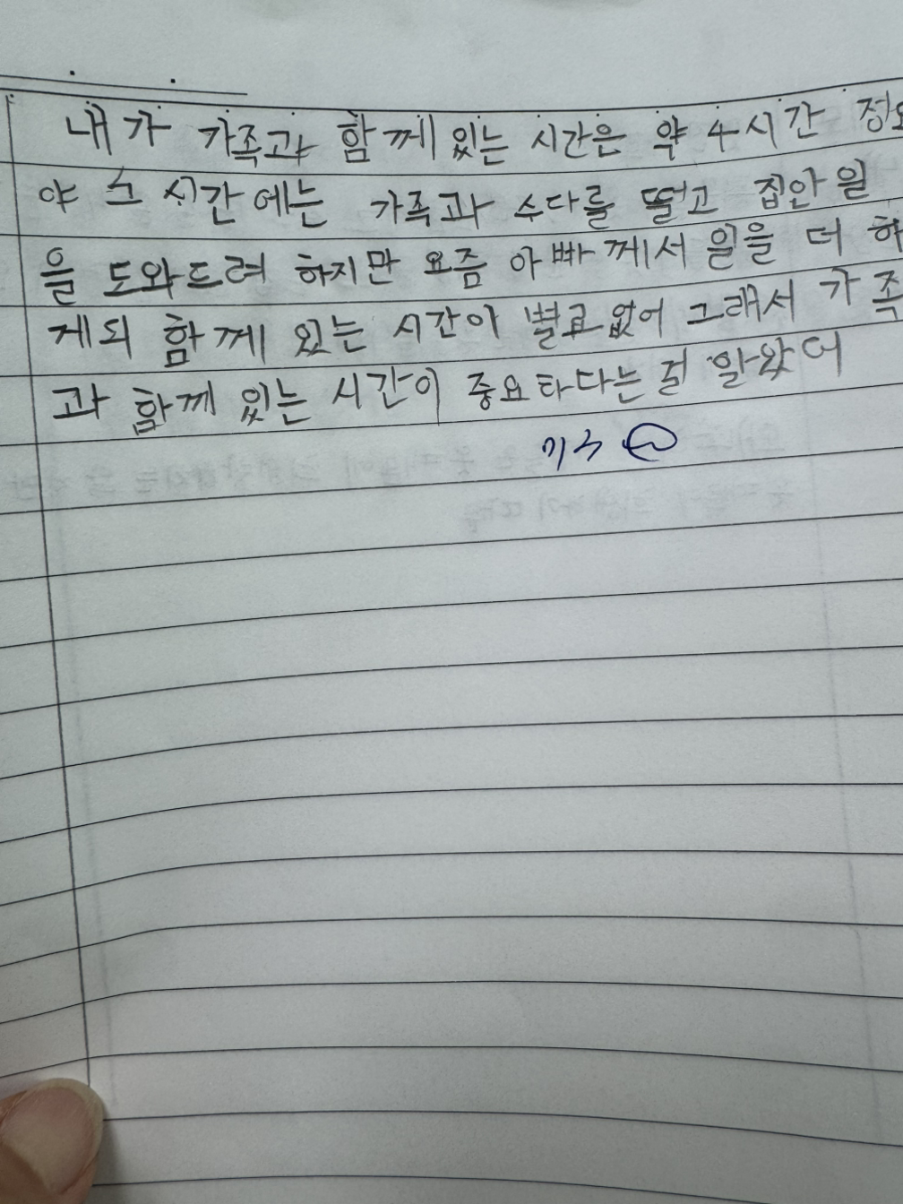 아이들에게도 세줄쓰기 주제를 주며 물어보았다. 하루 중 가족과 함께 보내는 시간은 어느정도인지. 또 그 시간엔 무얼하는지. 아이들의 글을 보니 내 예상처럼 대부분 가족과 함께 하는 시간이 턱없이 부족해보였다. 어떤 아이는 내게 "무조건 모든 가족이 함께 하는 시간을 적어야해요?" 라며 눈을 동그랗게 뜨고 물어보기도 했다. 아이들이 성장해갈 수록 함께 하는 시간은 그에 반비례하여 적어질 수 밖에 없으니 모두가 이해가 갔다.
