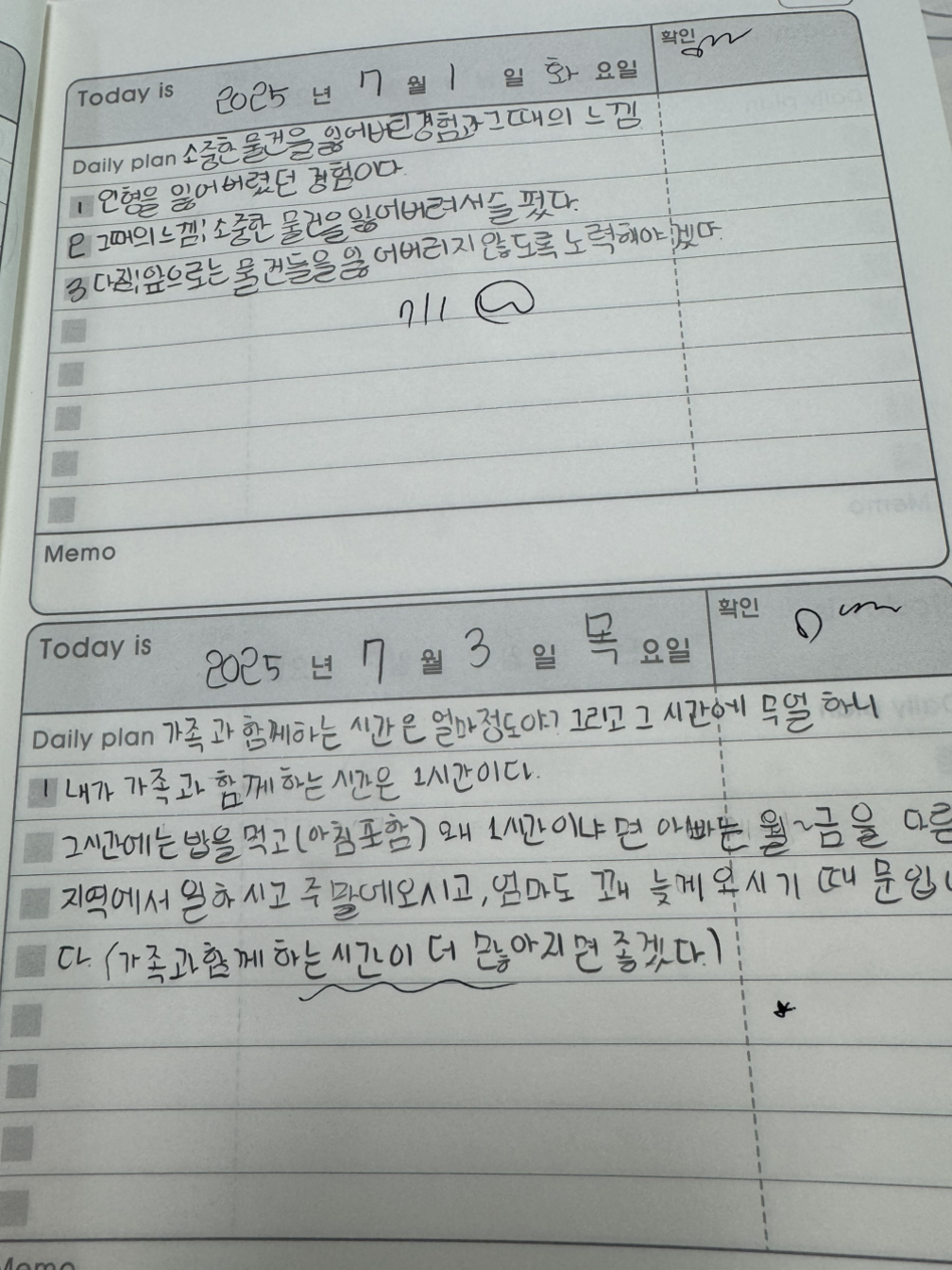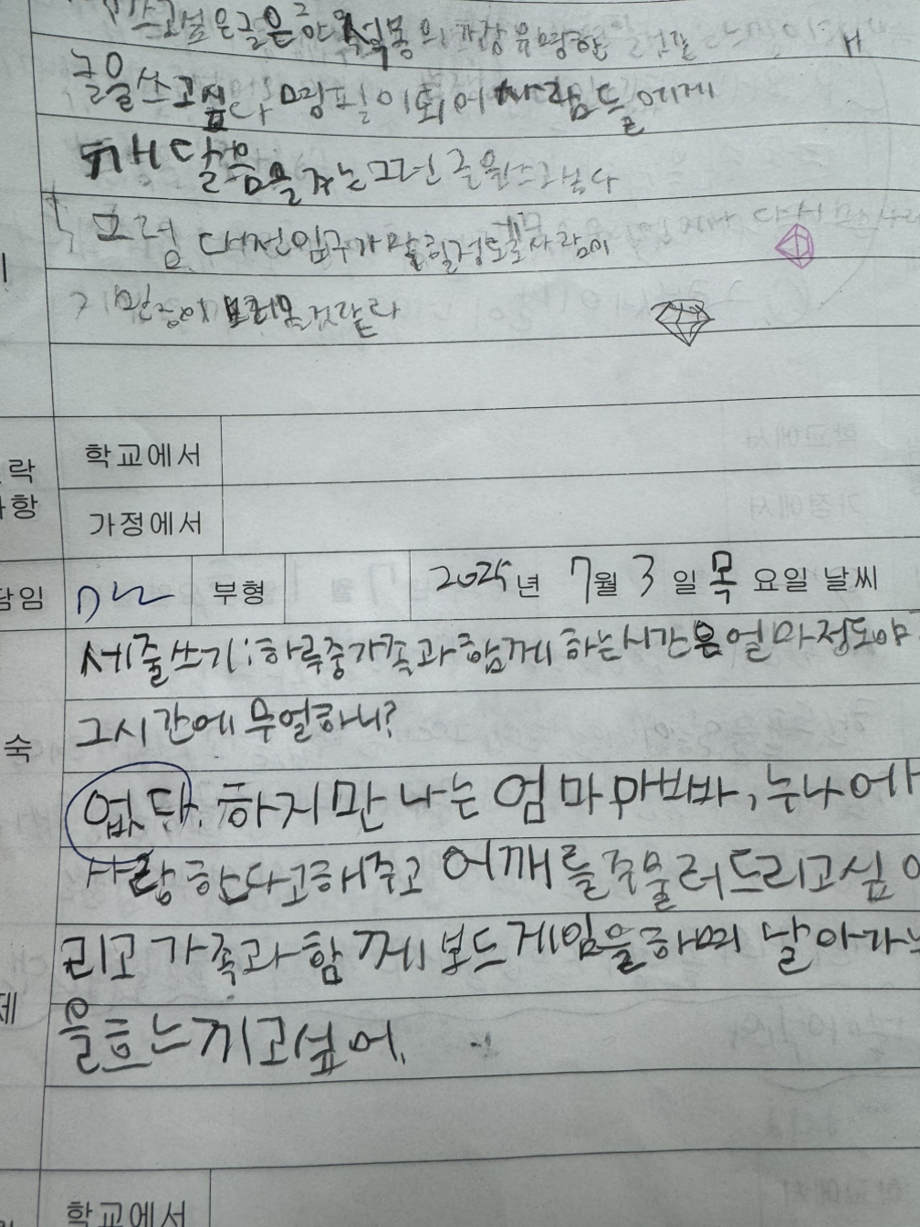 아이의 성격답게 무미건조하게 씌인 그 세 줄을 보고 난 뒤 내 눈엔 살짝 물기가 어렸다. 한동안 아이의 얼굴을 보며 조용한 식탁에서 힘없이 고개를 떨구며 밥을 먹는 모습이 계속 잔상으로 떠올라 마음이 아팠는데 그 세 줄을 보고 난 뒤엔 아이의 얼굴에서 잠들기 전 엄마와 도란거리며 이야기를 나누는 따뜻한 장면으로 화면전환이 되었다. 그 사실에 가슴을 쓸어내렸다. 짧게라도 엄마와의 시간을 보내며 뭉근하게 사랑을 느끼고 있구나 싶어서.
