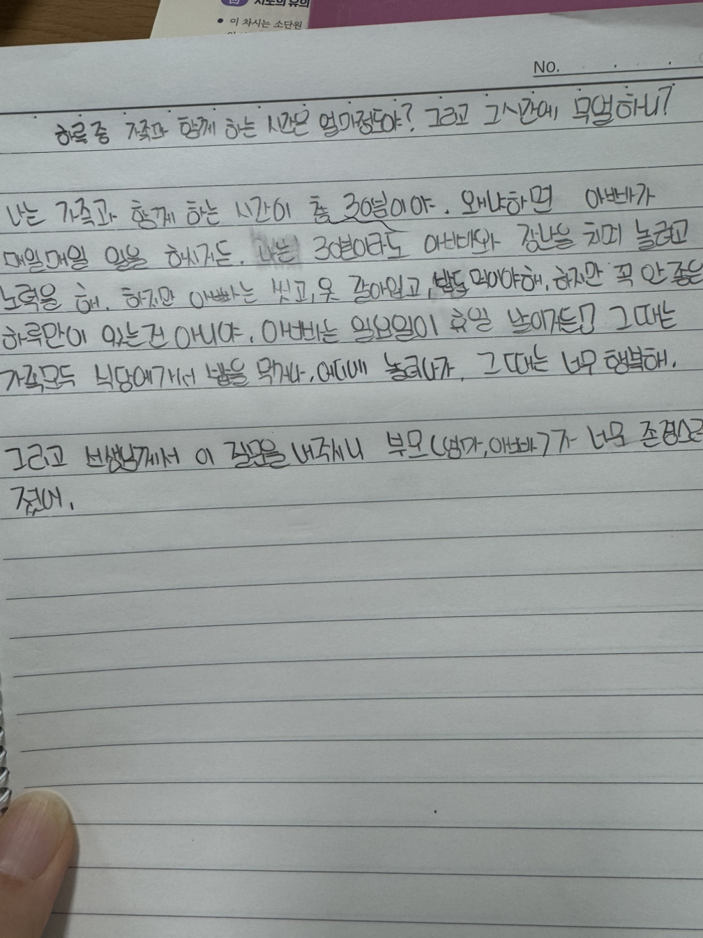"요즘 엄마 아빠가 바빠서 늘 늦게 퇴근을 하신다. 그래서 저녁을 온 가족이 다같이 둘러 앉아 먹는 시간이 잘 없는 것 같다. 어제도 나는 학원을 다녀와서 혼자 식탁에 차려진 저녁을 먹었다. 조금 외로운 느낌이 들었다."