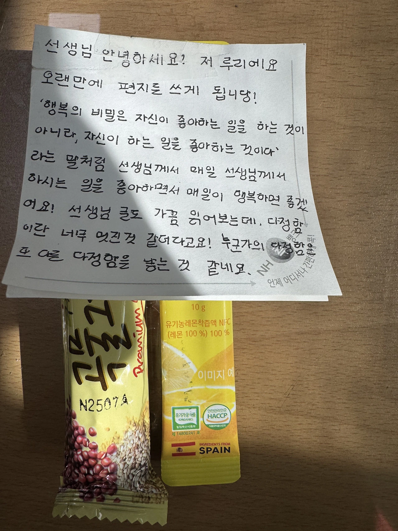 오늘은 출근해보니 작년 제자의 작은 메세지와 간식이 놓여있다. 작년 제자들이 잊지 않고 써주는 이런 다정함은 예상치 못한 기쁨을 선사한다. 학년이 바뀐 지 자그마치 열달이 넘어가는 시점에도 불구 여전히 나를 잊지 않고 고마움을 표시하는 그 따스한 마음은 내게 쉽게 옮아와 우리반 아이들에게도 그 마음을 전달하게 만든다. 오늘 하루는 이 아이의 다정함이 내게 기분좋은 각성효과를 일으켜 5교시에 아이들과 함께 피구를 하기로 했으니 말이다.