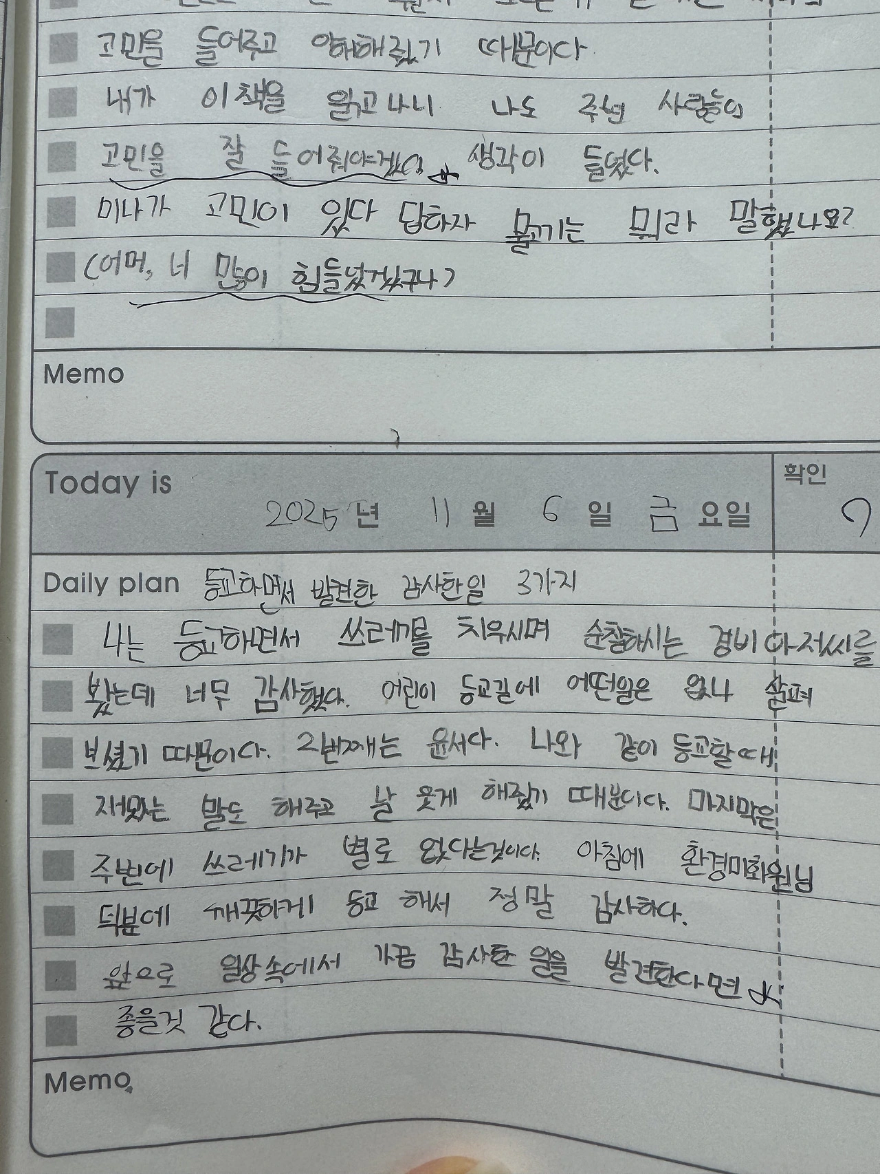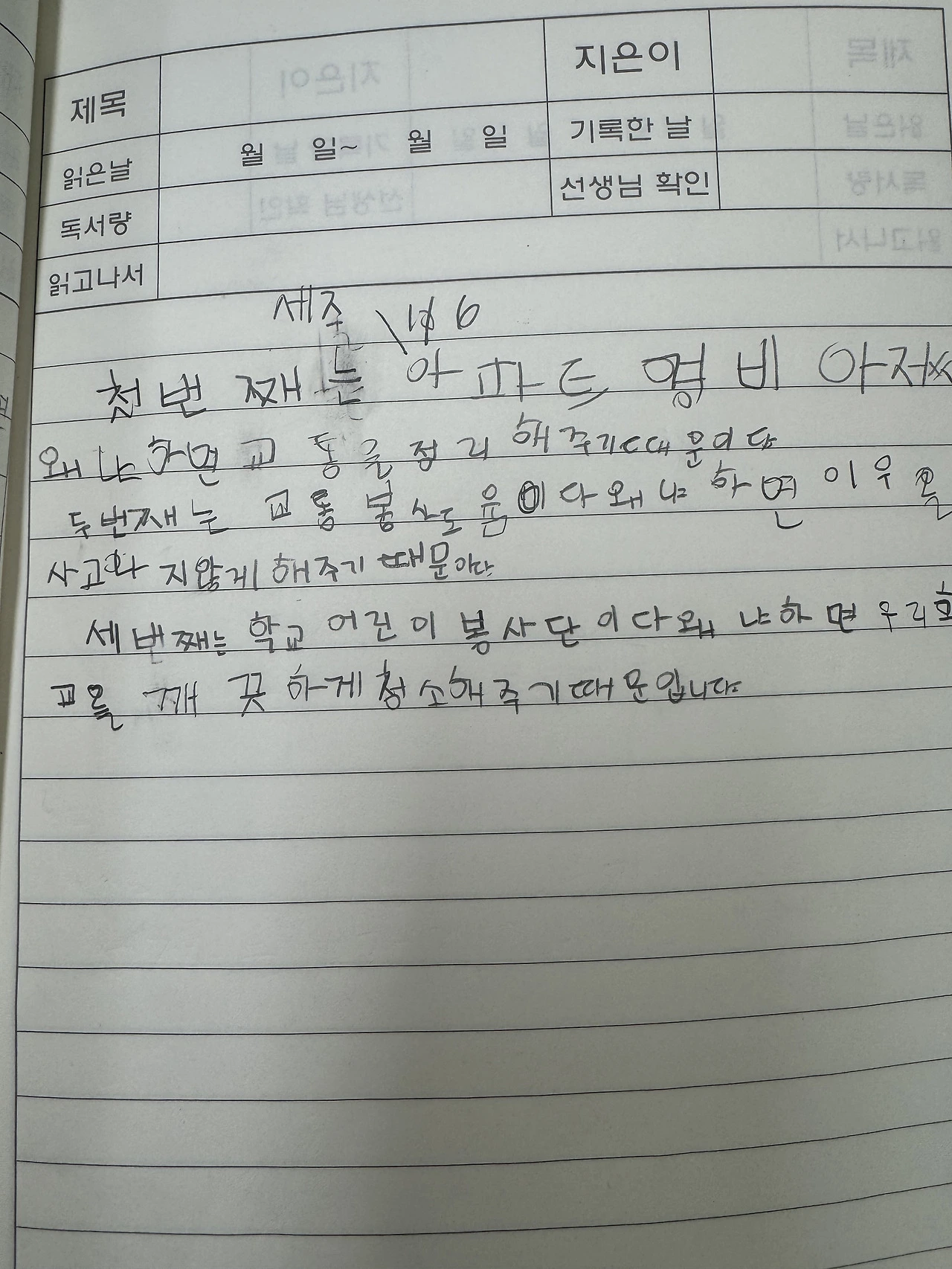 "먼저 아침에 아파트를 깨끗이 치워주신 경비아저씨께 감사합니다. 그리고 교문 앞에서 교통 봉사를 해주시는 꿈나무 지킴이 아저씨 분들. 또 교실로 오는 모퉁이 책방에서 열심히 책정리를 해준 친구들에게도 감사합니다. 이렇게 오늘 하루 감사한 일이 참 많다는 사실에 또 감사합니다"