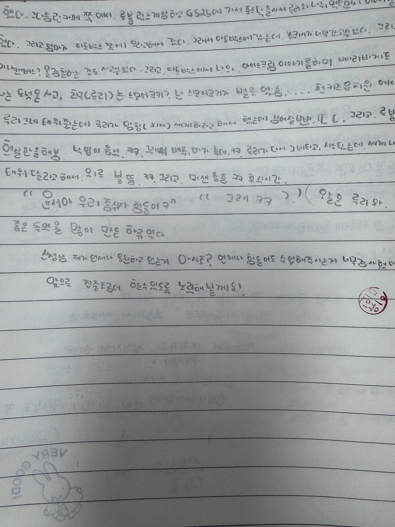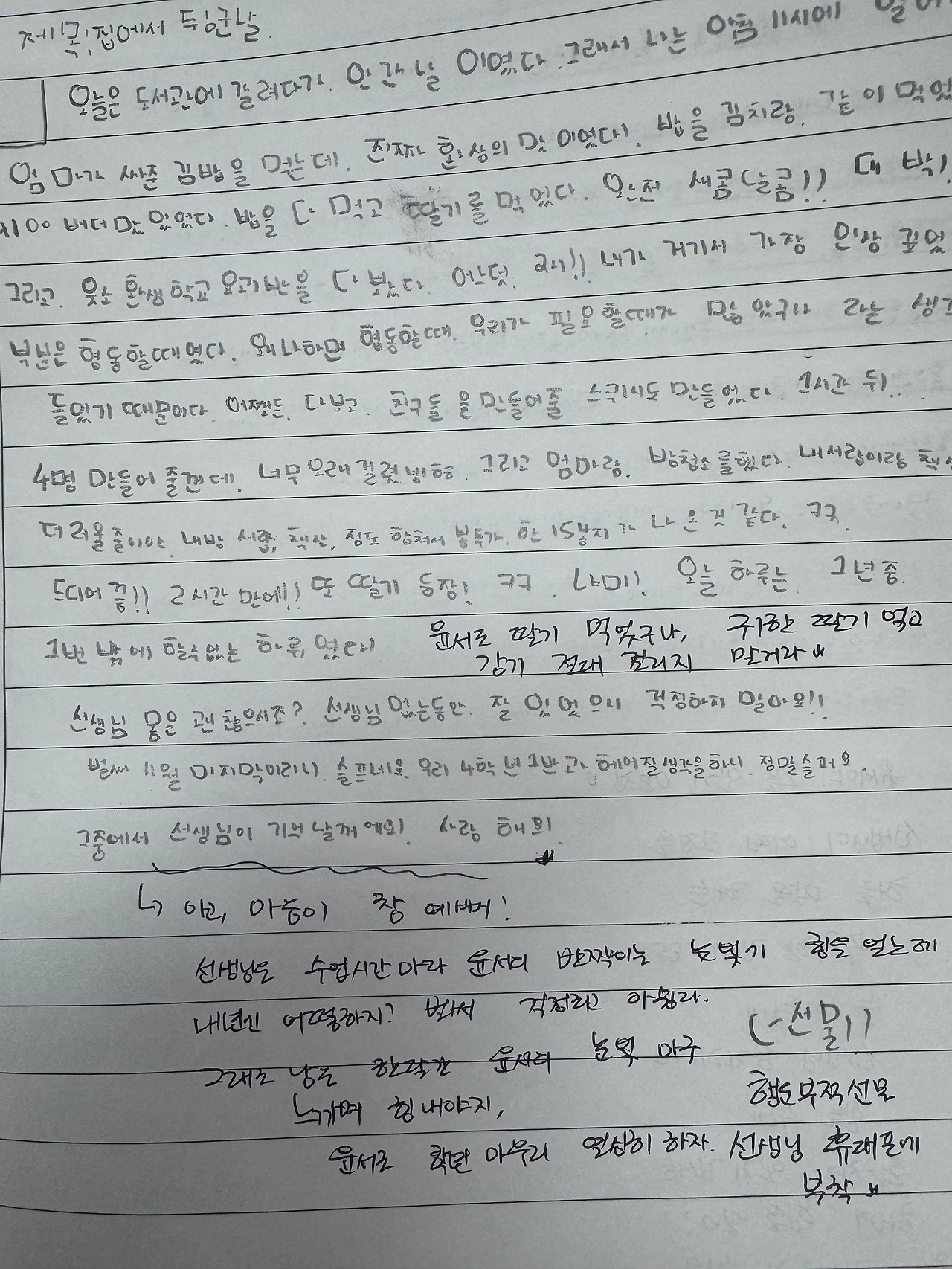 그 일기장의 주인공은 바로 우리반 한 여자아이. 오늘은 일기검사에서 글씨를 바르게 쓰세요. 느낀점을 꼼꼼히 써보세요.내용을 좀 더 자세히. 이런 조언의 글로 힘을 빼기 보단 아이의 글에서 힘을 얻고 싶은 날이었다. 그런 면에서 이 여자아이의 일기는 나를 실망시키지 않으리라 생각하며 조심스레 빼든다. 역시나 오늘의 일기에도 나를 향한 작은 응원의 메세지가 붙어있다.