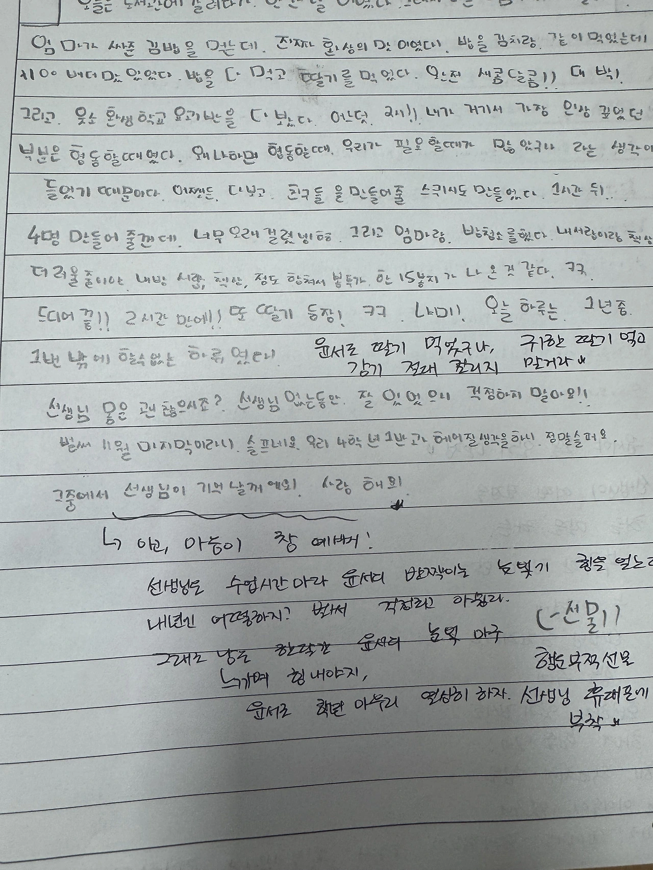 이 아이로 말하자면 개학 첫 날부터 내게 손하트를 만들어보이며 애정공세를 해준 유일한 아이였다. 내포형성도 잘 되지 않은 시기라 갑작스런 제스쳐에 나는 적잖이 당황했지만, 나의 뜨듯미지근한 반응에도 손하트를 끊임없이 내어보이며 애정을 표시한 아이였다. 2학기에 들어선 사춘기가 왔는 지 손하트는 물러가고 일기를 통해 끊임없이 애정을 표해준다. 천성이 무뚝뚝한 내게 이 아이의 애정공세는 참 새롭게 다가왔다. 처음엔 어색했던 그 표현들이 시간이 흐르며 가랑비에 옷젖듯 자연스레 내게 스몄고 이제는 그 표현이 단순히 잘 보이기 위함이 아니라 정말, 나를 향해 보이는 애정이라는 것을 가슴 뜨겁게 인식하는 중이다.