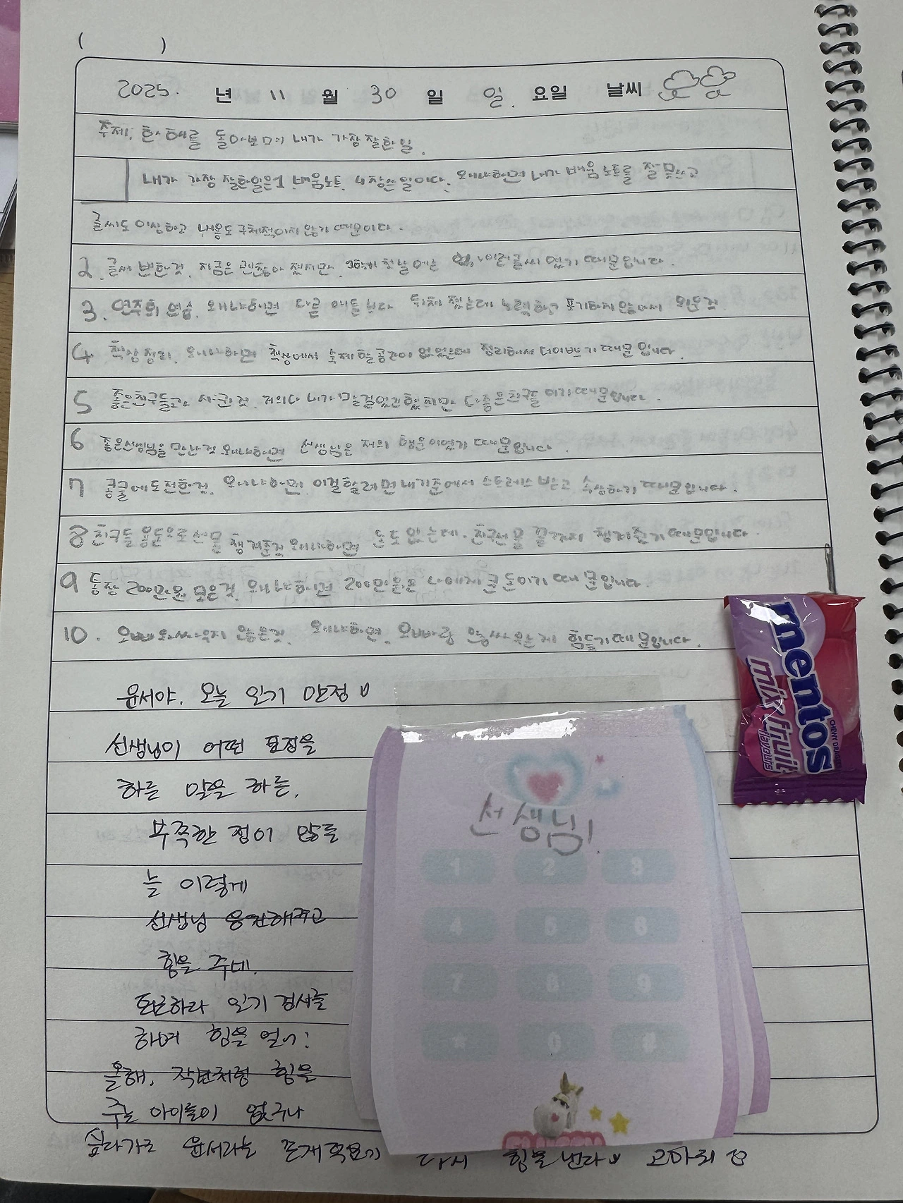 오늘따라 눈물나게 고마웠다. 6교시를 겨우 버텨낸 내게 아이의 일기장 속 응원의 메세지는 내 가슴을 뜨겁게 적셨다. 하루 종일 축 쳐져있던 어깨를 잠시 쭉 올리고, 창문을 열어 한기가득 상쾌한 초겨울 공기를 가슴 가득 들이마신다. 그리고 요 며칠 조금 소홀했던 명언을 고심해서 적어내고 하루종일 열을 내며 돌아가던 컴퓨터 스위치를 끈다.
