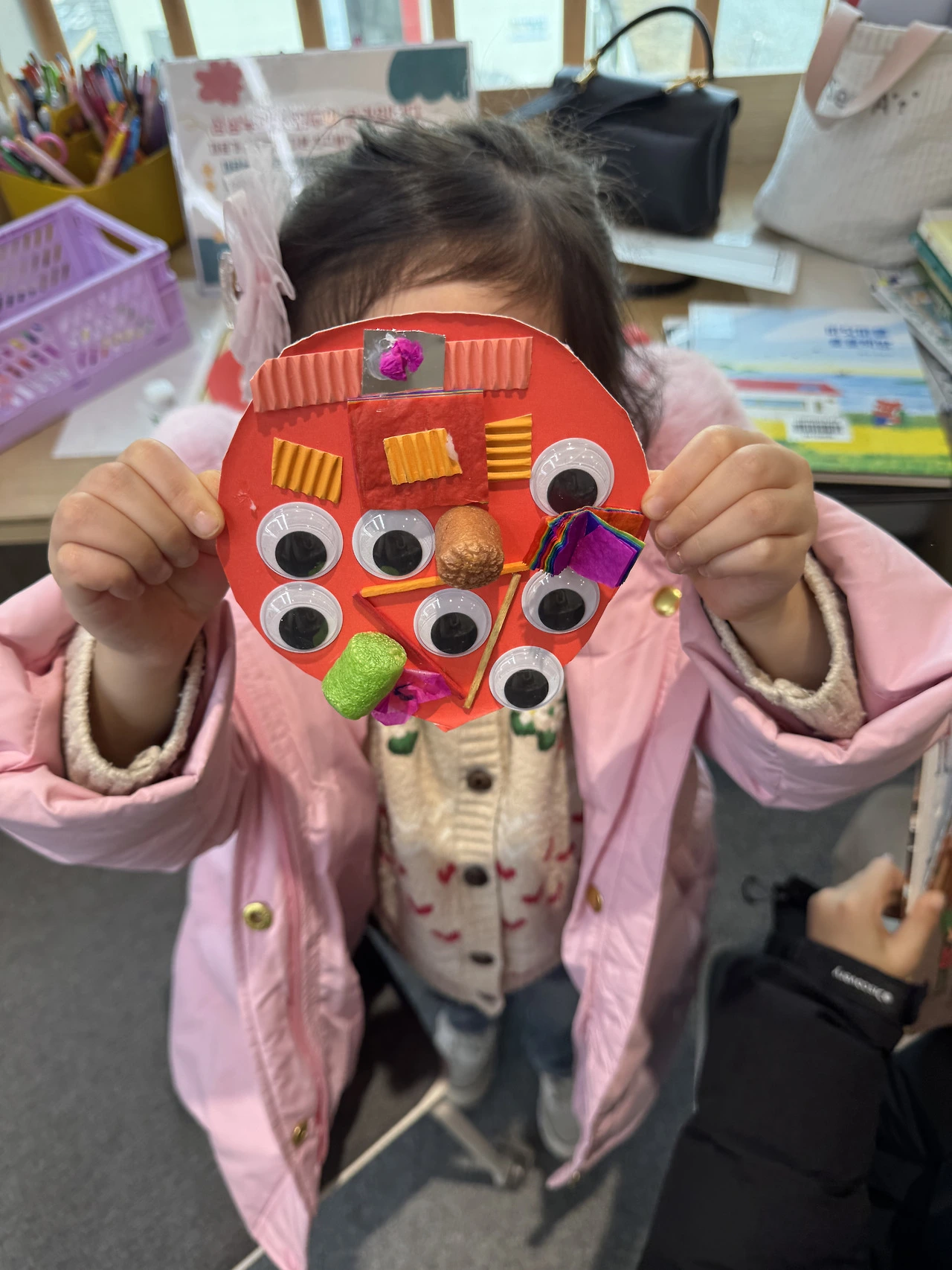 바로 그 때, 도서관 직원이 우리 쪽으로 다가오는 인기척이 느껴졌다. 나는 5분만이라도 더 시간을 달라고 애걸해볼까 말하려던 찰나 내 예상과는 달리 직원은 우리 쪽에서 멀어지며 책장을 향했고 비어져나온 책들을 정리하는 것이 아닌가? 나는 안도의 한숨을 내쉬며 아이가 무사히 나머지 눈과 장식을 붙이며 마무리할 수 있기를 간절히 바랐다. 그렇게 도서관 직원의 책정리는 10분이 넘게 이어졌고 그 시간 동안 우리에게 다가오는 일은 다행히도 없었다. 아이의 작품이 완성될동안 내 신경은 온통 도서관 직원의 행동에게 쏠려있었지만 말이다. 드디어 마지막 눈을 붙이고 회심의 미소를 지어보이는 딸. 나는 말대신 쌍엄지를 추켜올려주며 완성을 축하했다. 그리고 나는 속으로 안도했다. 아, 도서관의 적막을 깨는 울음소리를 듣지 않아도 되겠구나 조용히 되뇌이며.