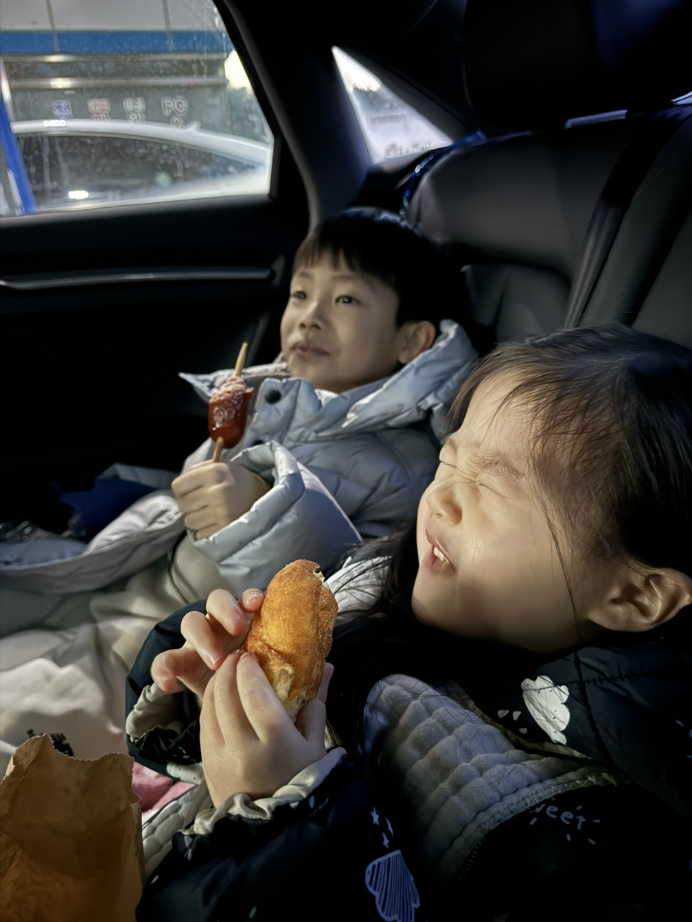 두 아이와 함께 내려가는 길. 휴게소에서 산 간식으로 허기 채우기. 먹어도 먹어도 마음의 허기는 안채워진다