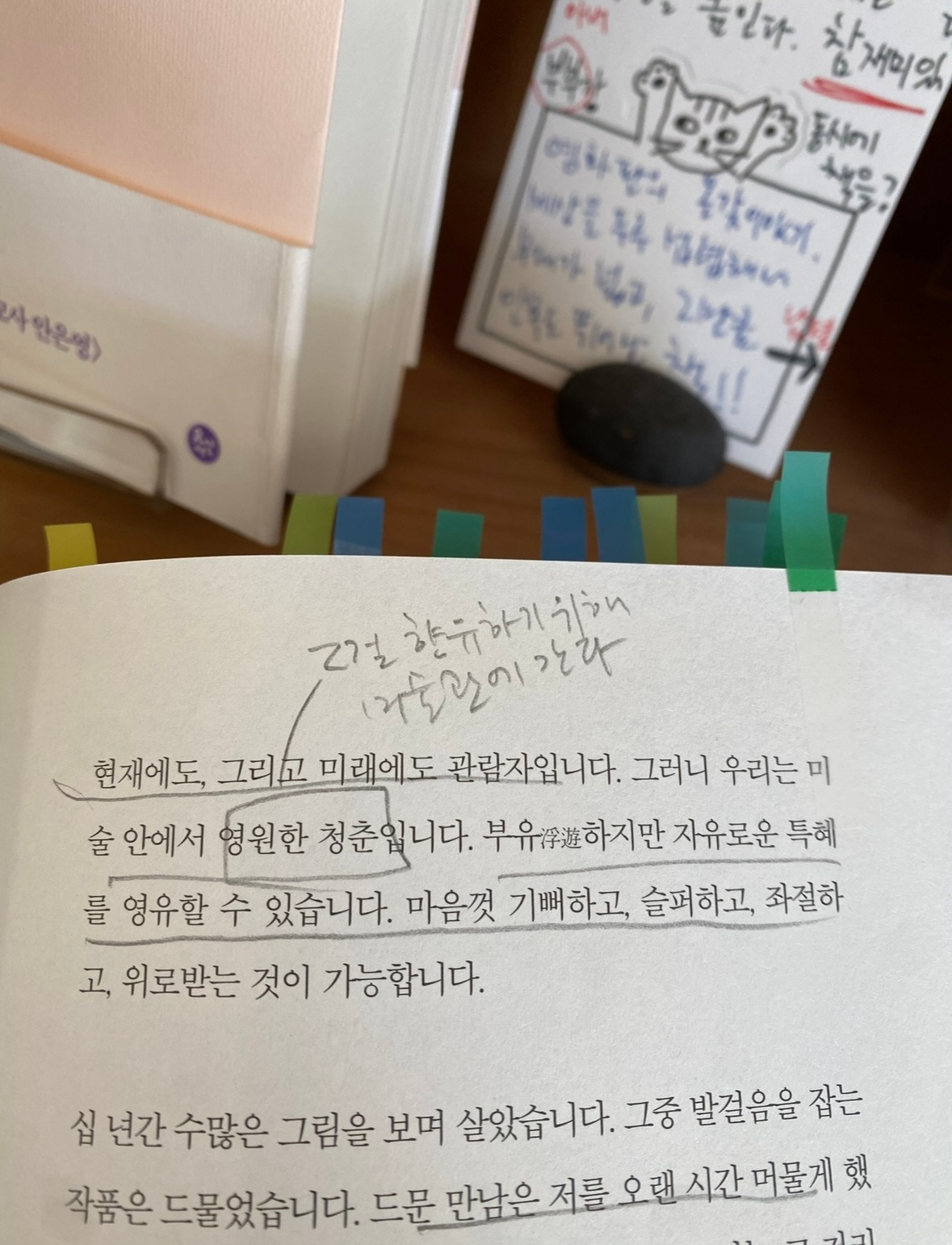 종로를 찾는 두 번째 이유는 많은 미술이 있기 때문이다. 국립현대미술관 골목을 따라 걸으면 다양한 갤러리가 나온다. 개중 나는 국제갤러리와 PKM갤러리를 가장 애정한다. 억지롭지 않은 큐레이션과 담담한 작품들이 많이 담겨있다. 책에서 말하듯 오랜 시간을 머물게 하는 드문 작품들을 더럿 발견하곤 했다.