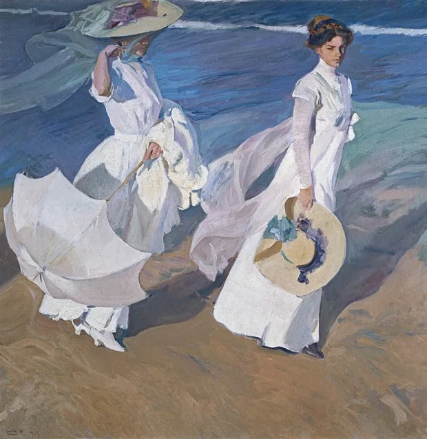 바닷가 산책은 소로야 작품 중 가장 유명한 작품이다. 나도 눈길이 많이 가는 작품이다. 평생의 뮤즈였던 아내와 큰딸이 해변을 걷는 모습으로 두 여인의 새하얀 드레스에 소로야 특유의 빛 표현이 잘 나타나 있어, 인물과 풍경을 더 돋보이게 한다.
