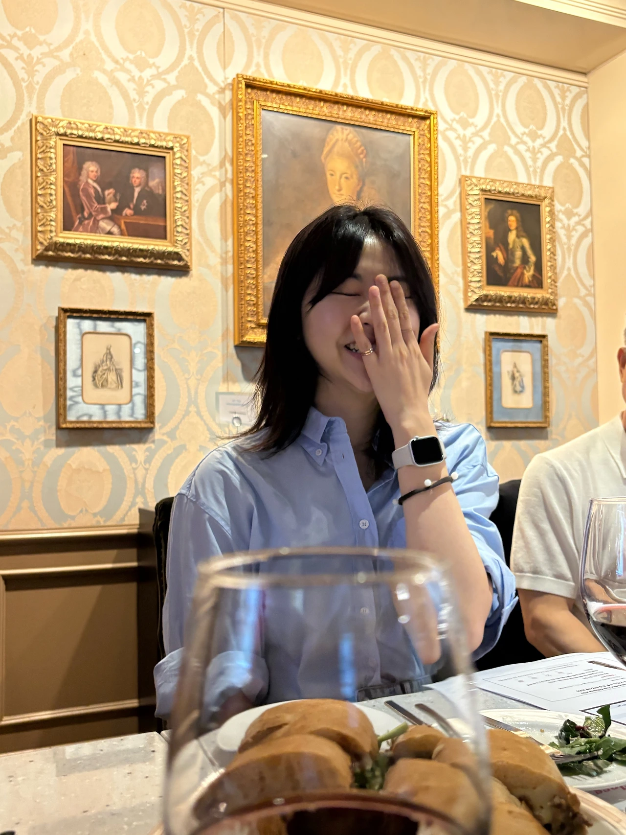 앞에 앉아계신 너무나도 고우셨던 어머니께서 많이 찍어주셨다. 부끄러워 웃고 있는 이 사진이 마음에 들어서! :) 이날 와인도 무려 세잔이나 마시고 좋은 그림에 유익한 대화가 곁들여지니 많이 신났던 것 같다. 그리고 영광스럽게도 사진을 찍어주신 분은 조승연 작가님의 어머니였다.