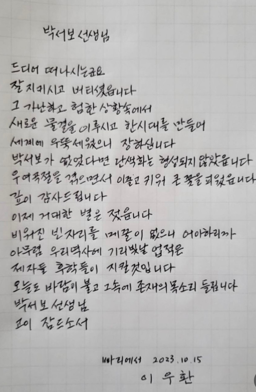 파리에 계신 이우환 화백님이 보낸 편지, 글이 마음에 새긴다.