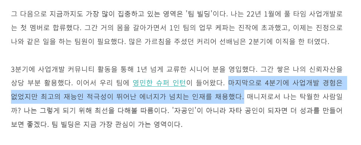 그래서 회사 안에서 주어진 역할만 잘 수행하는 것은 충분하지 않다고 느꼈다.