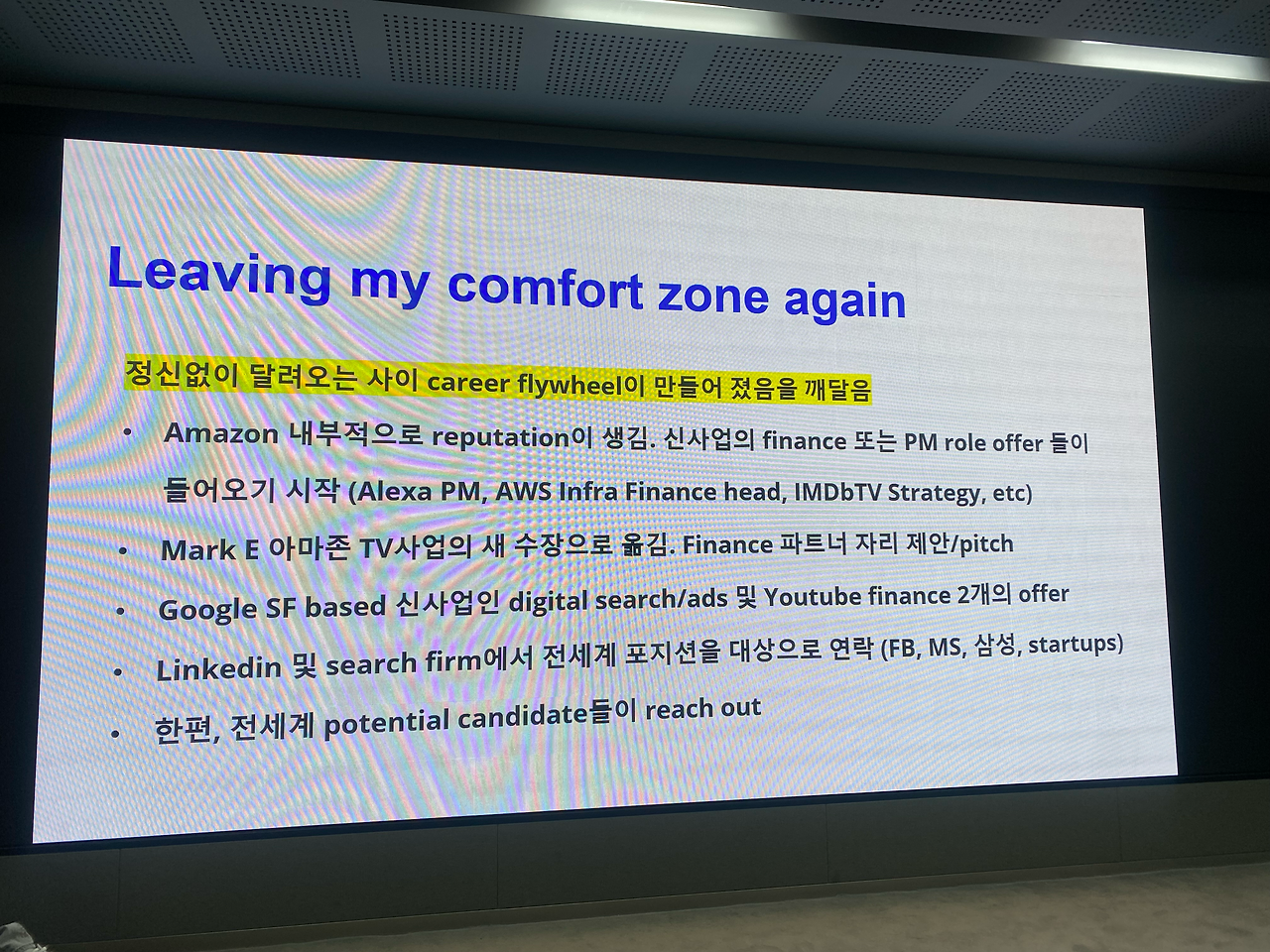그래서 내 걱정을 혼자 끌어안는 대신, 이 고민을 들어줄 사람들을 찾아 나섰다. (돌이켜보면, Comfot Zone에서 벗어나기 위한 첫 스텝이었다.)
