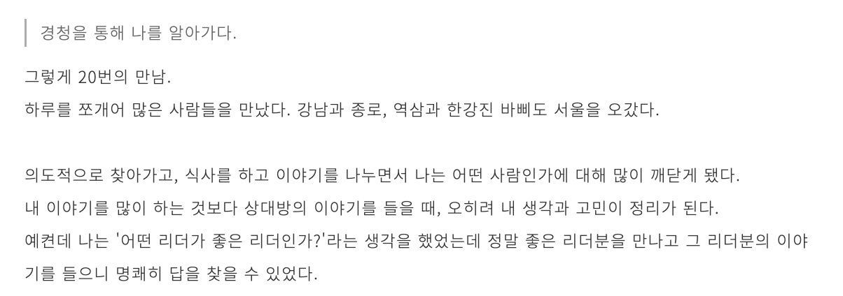 한기용 님 커리어 코칭 세션 20기를 듣고 있다. 옳은 커리어를 가고 있는지, 내가 정의하는 옳음은 무엇인지 궁금해졌다. 하긴 나도 벌써 사회에 나와 내 힘으로 돈을 번지 어언 7년이다. 중간 점검 할 때가 됐다. (커리어의 반에 반, 반에 반의 반, 반에 반의 반의 반,^^?) 지인의 추천으로 참여하게 됐고, 마침 좋은 타이밍에 서울 오프라인 밋업에도 참석했다. 이미 과정을 수료한 선배님들과 이야기 나누며 이 선택 잘했다는 확신이 들었다.