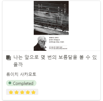 - Review: 저물어가는 그 날까지 육체적 고통보다 창작의 고통을 우선시한 사카모토에게 경의를 표하며, 진한 여운을 남겨준 사카모토에게 감사의 마음을 전한다. 그의 음악과 함께 책을 읽는 날들이 슬프기도 때론 행복하기도. 지금도 명상이 필요할 때면 energy flow를 듣는다.