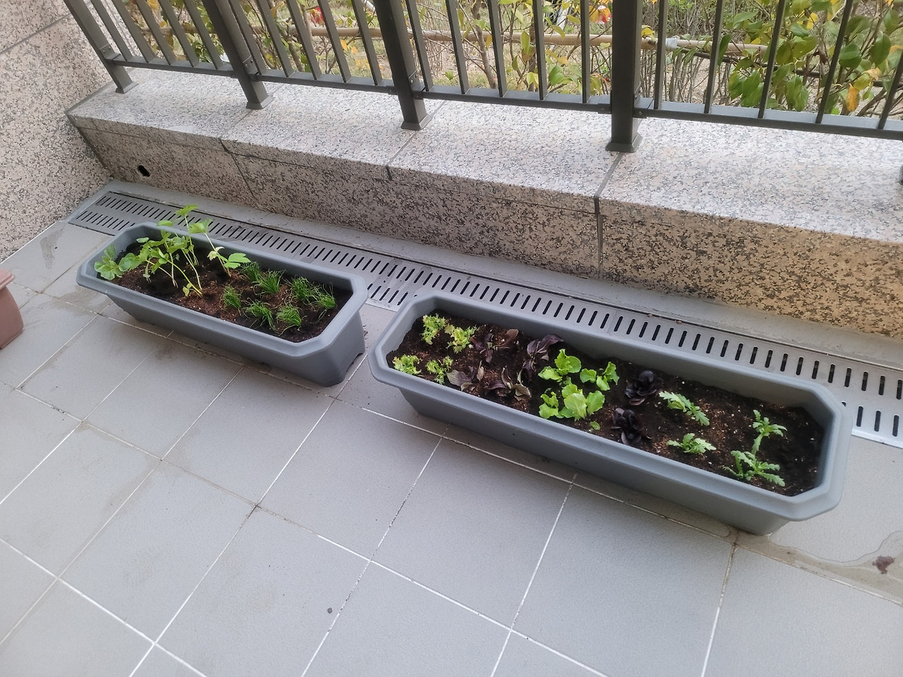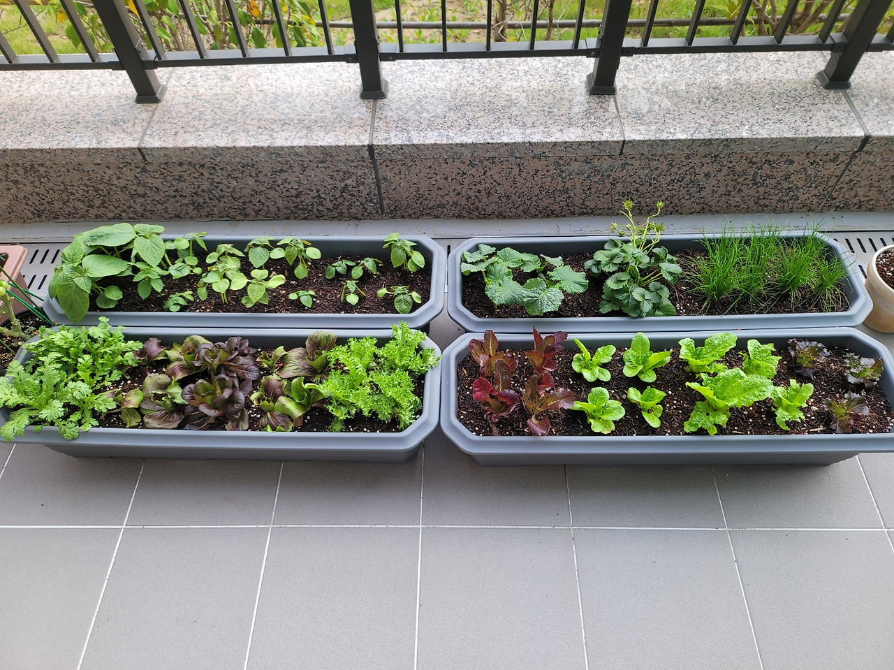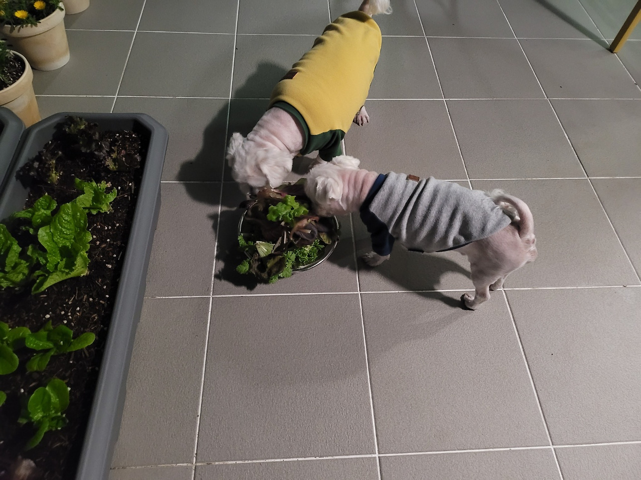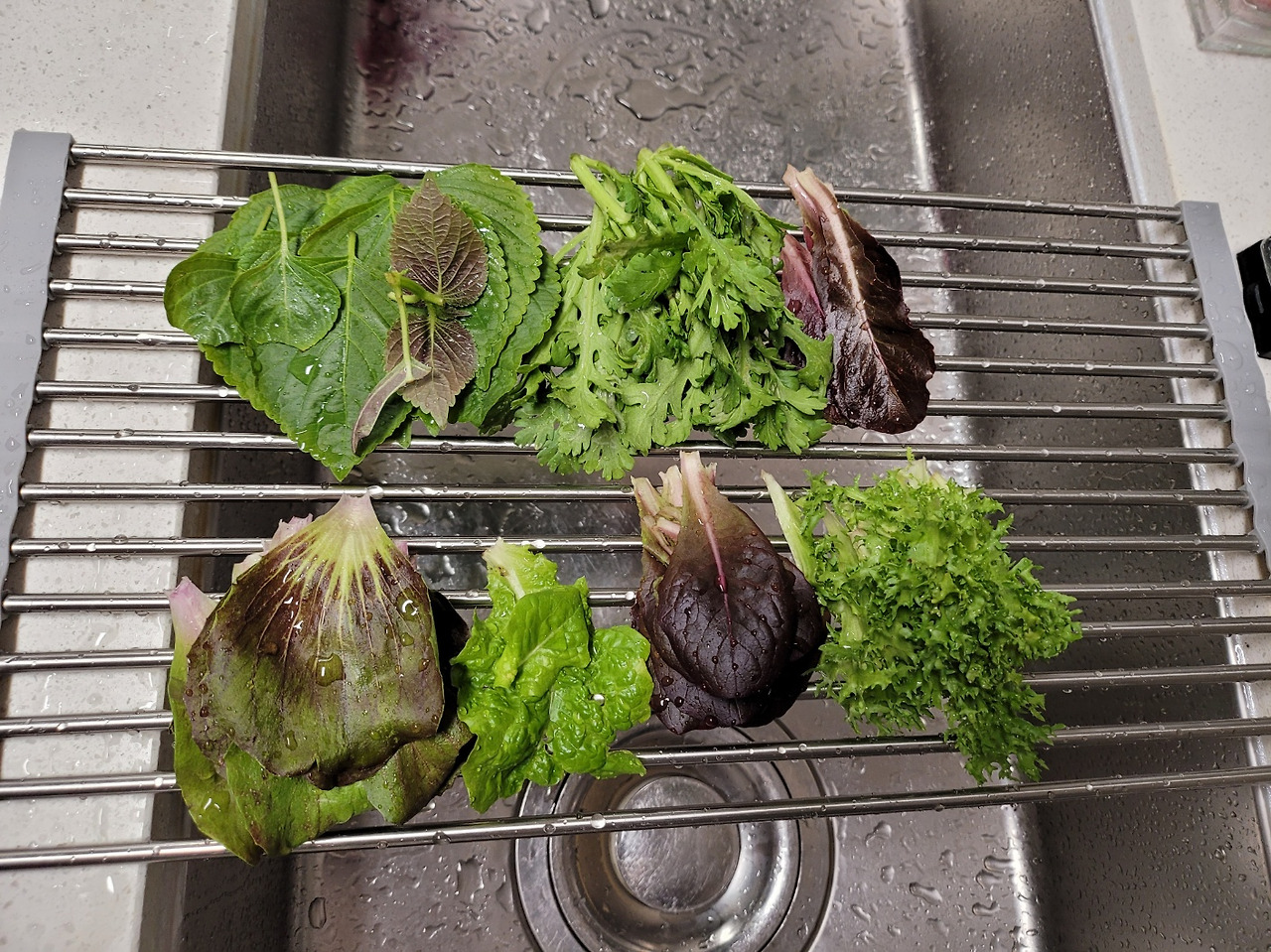 며칠 지나니 화분 크기에 비해 야채 분포도가 높아 화분이 좁아 보였고, 어쩔 수 없이 큰 잎 위주로 몇 개씩 쏙아냈다. 어린잎이라 보들보들했고 향은 사 먹는 야채보다 진했으므로 남편은 첫 수확에 반했다.