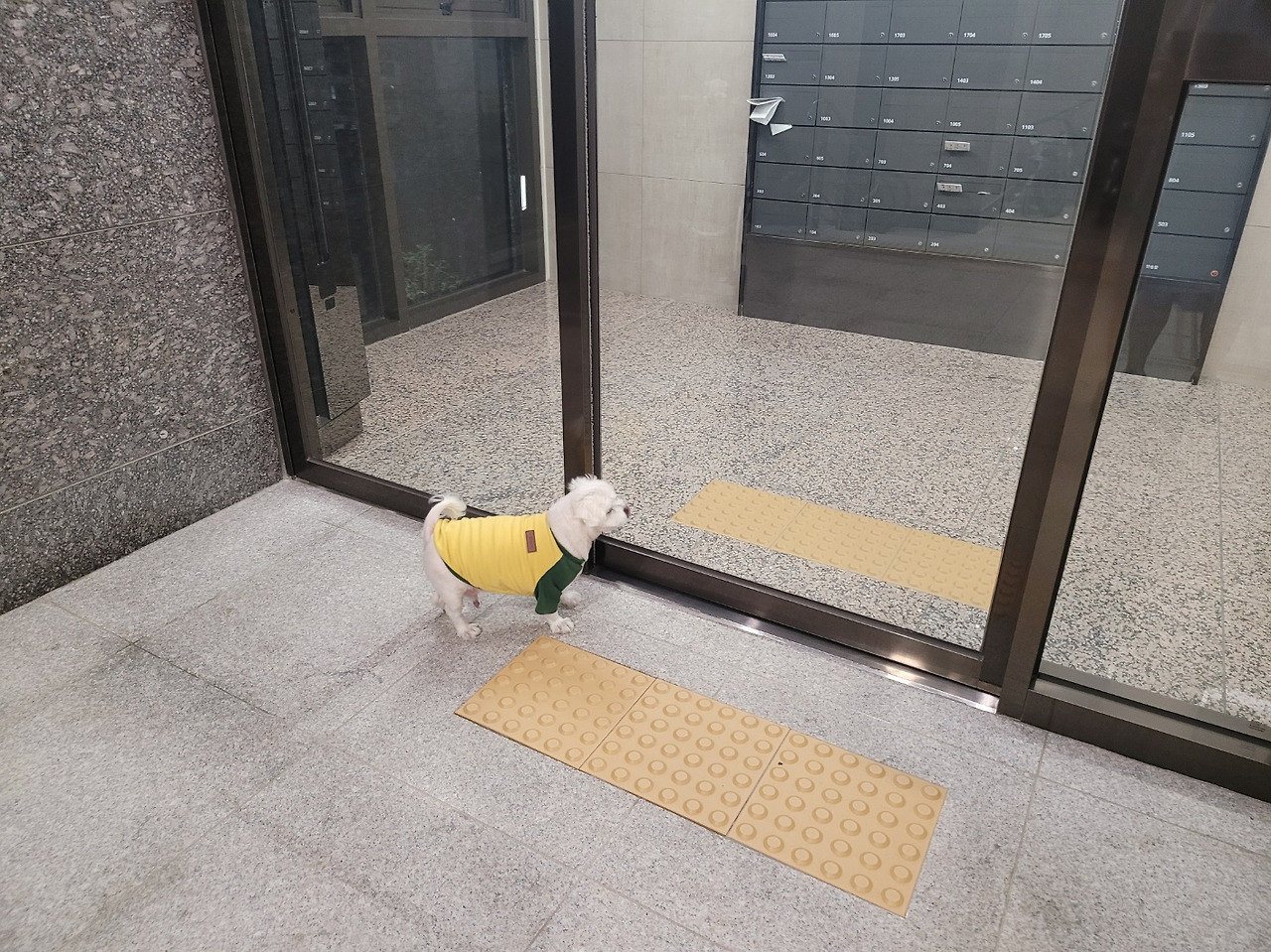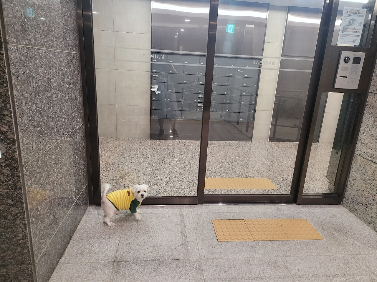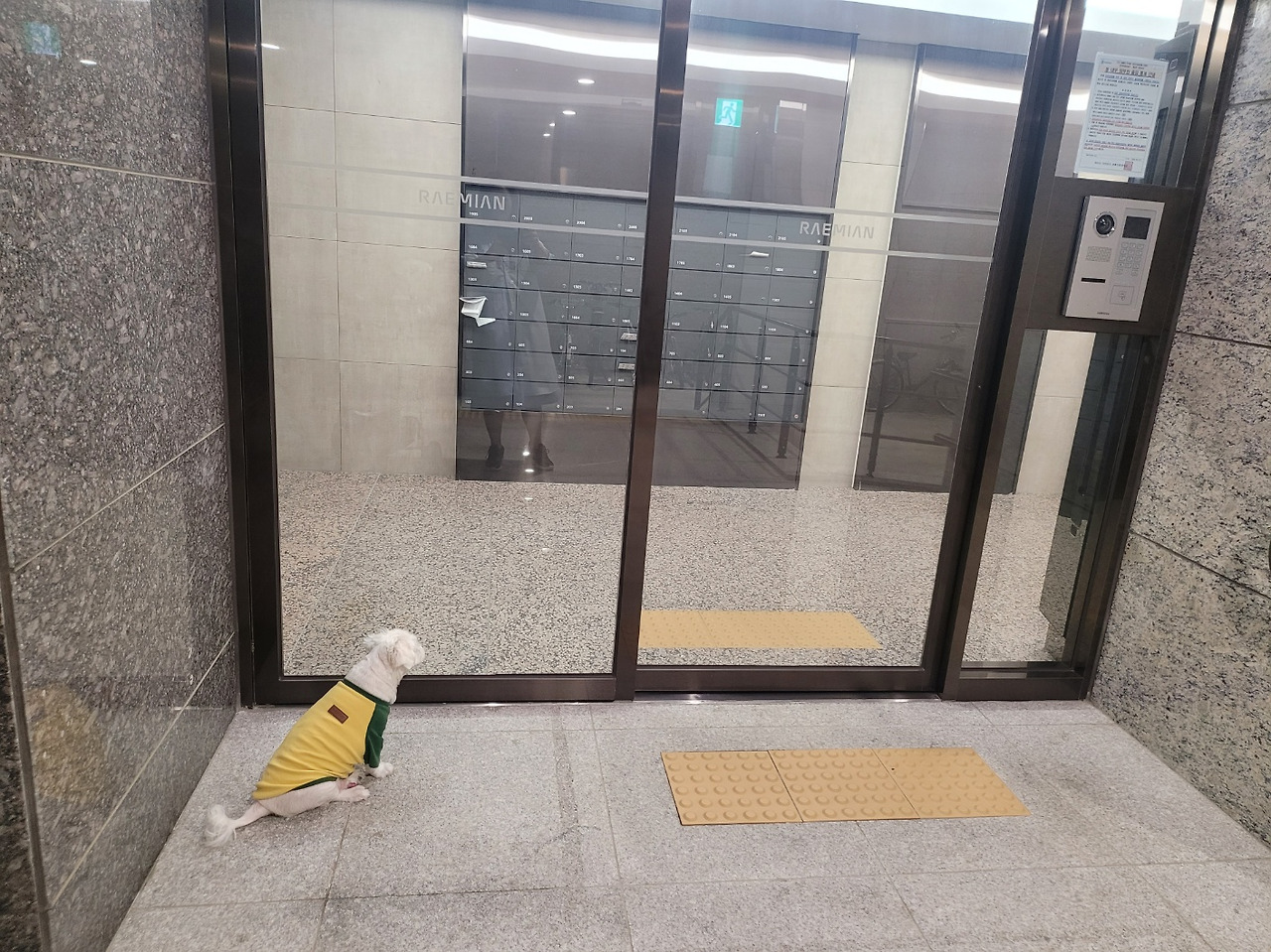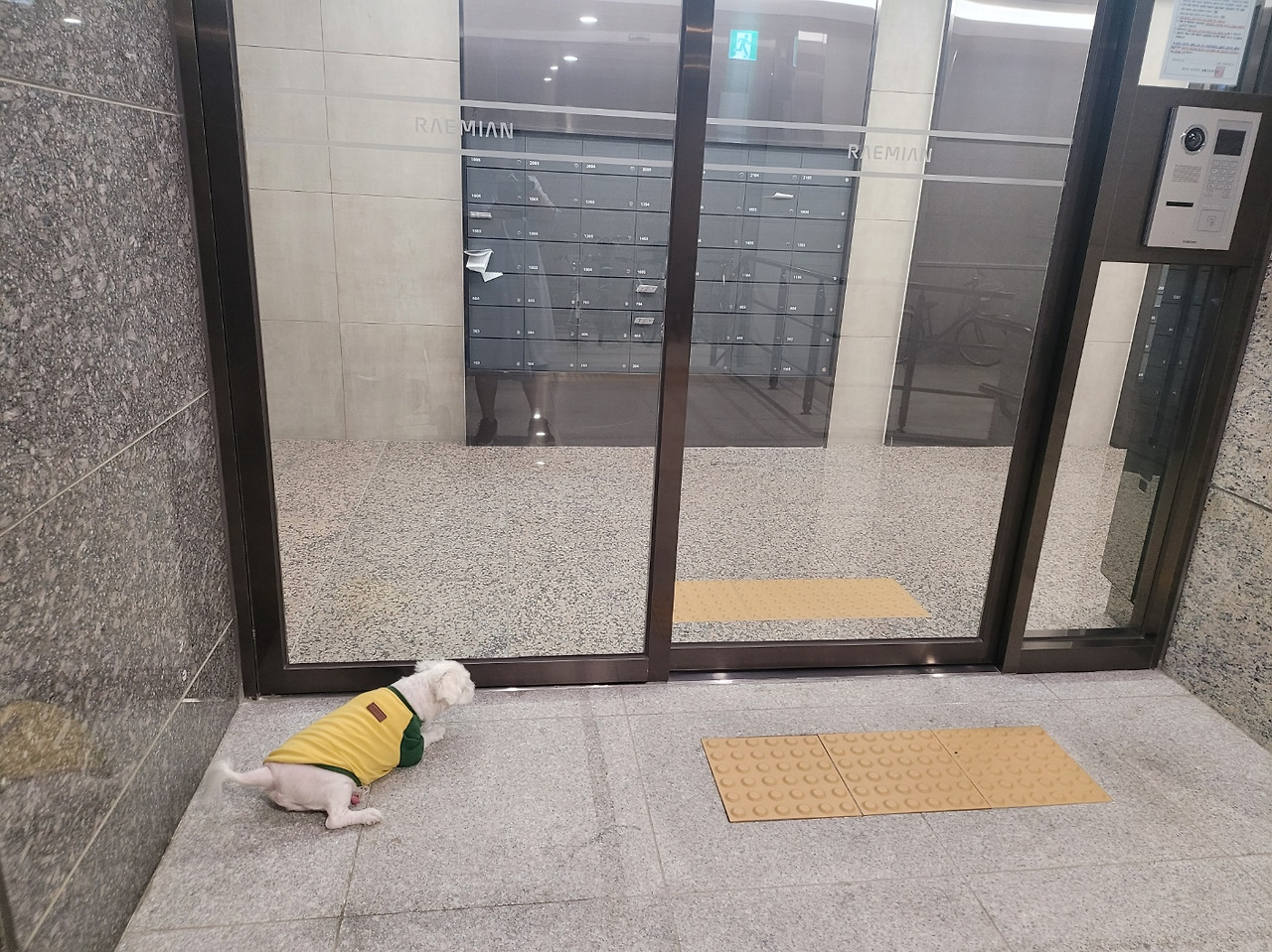 유모차에서 내린 뽀는 왔던 길을 되돌아가서 동생이 들어간 공동 현관문에서 발을 동동 구르며 문을 열어달라고 아우성이다.