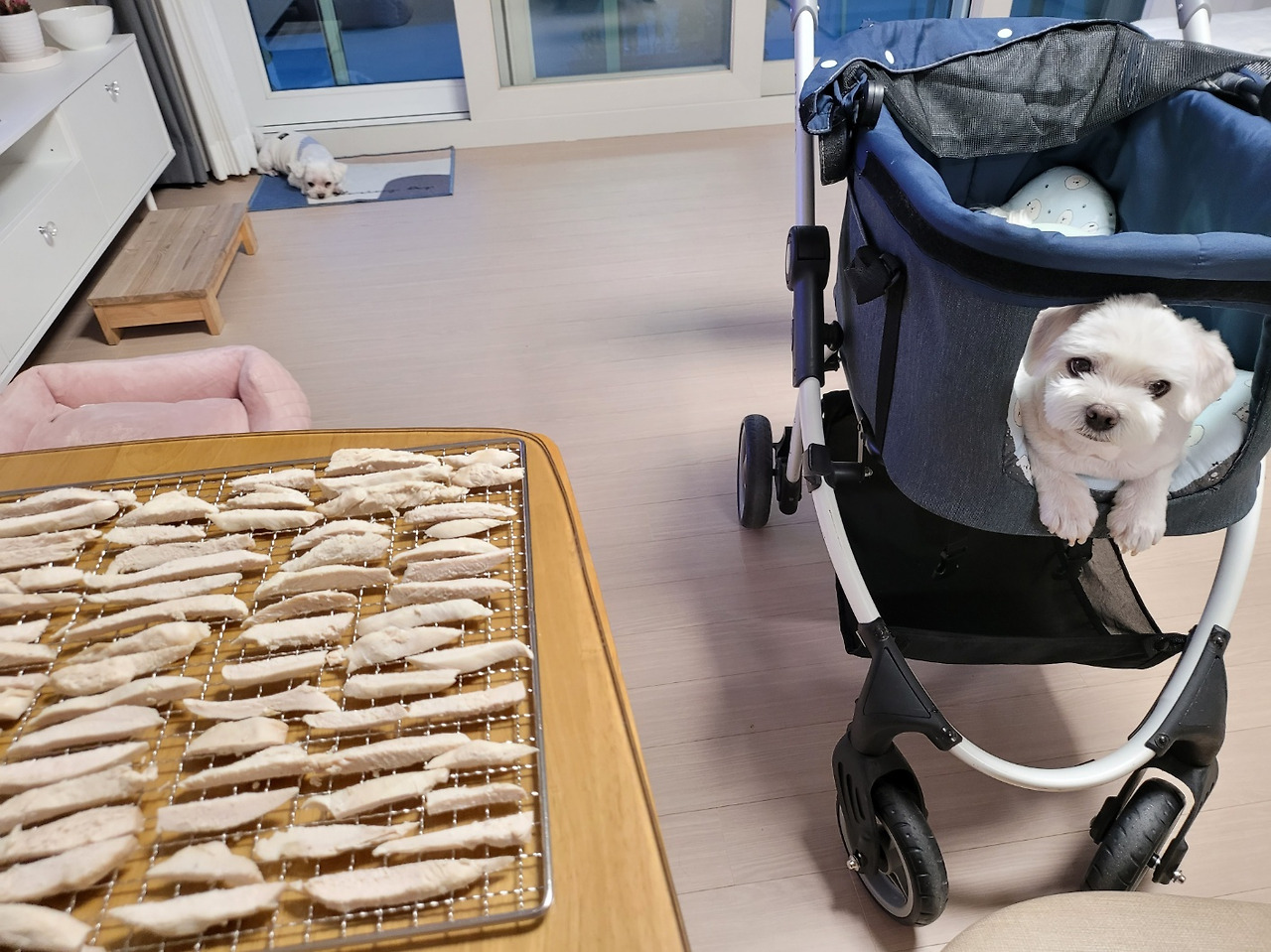 뽀, 뿌의 간식이라고는 고구마말랭이가 전부인데, 이제 몇 개 안 남았다.