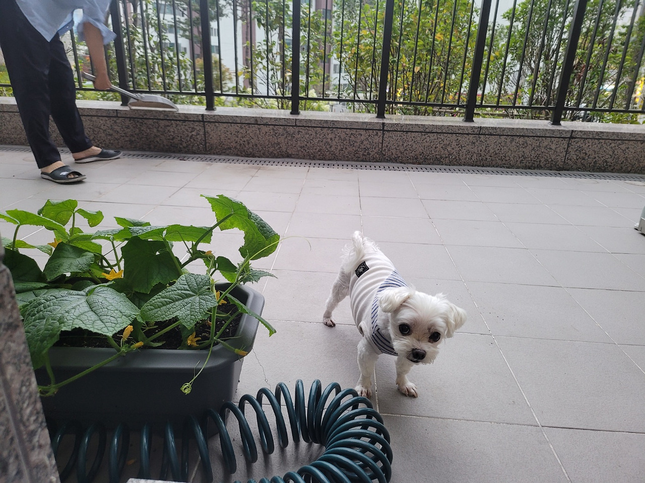 남편은 며칠 내린 폭우로 엉망이 된 테라스를 청소했고, 호기심 많은 뿌는 청소하는 테라스도 궁금하고 고구마를 한입 얻어먹을 수 있을까 눈치를 보면서 왔다 갔다 제자리에 머물지를 못한다. 귀여운 녀석~ㅋ
