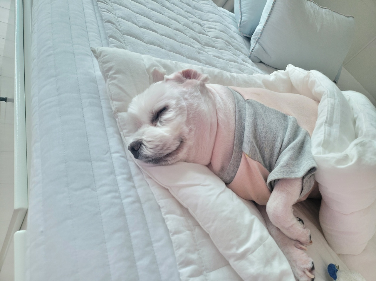 새벽 5시면 뽀가 일어나 물을 마시고 쉬를 하고 다시 침대로 돌아온다.