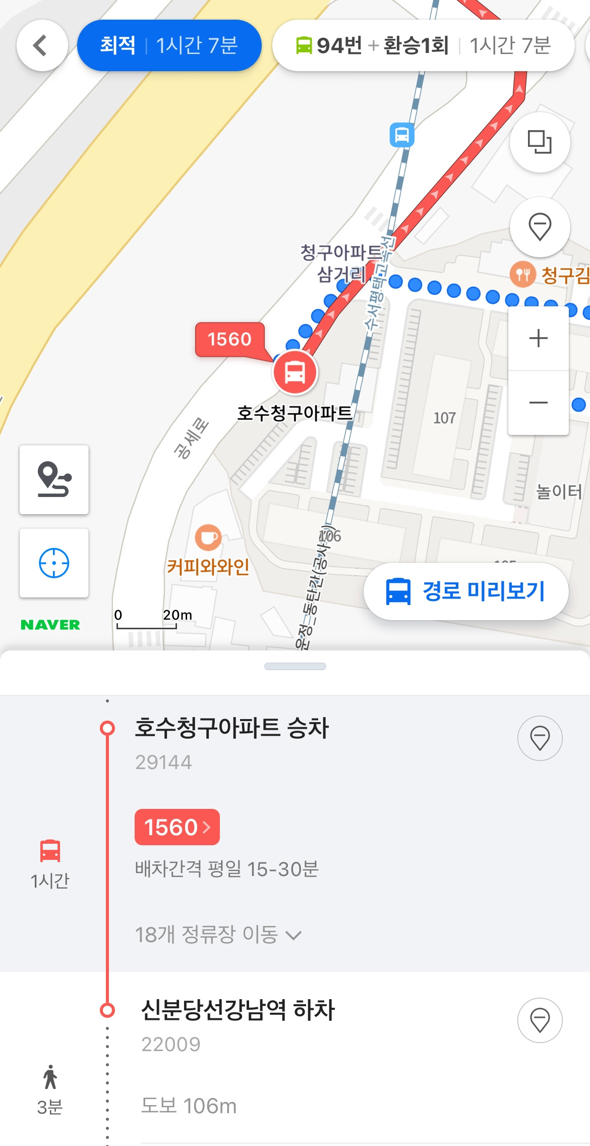 2. 그러나 강남행 1560번은 배차 10분마다 아파트 입구 앞 정류장에 선다. 신분당선 강남역까지 약 1시간.