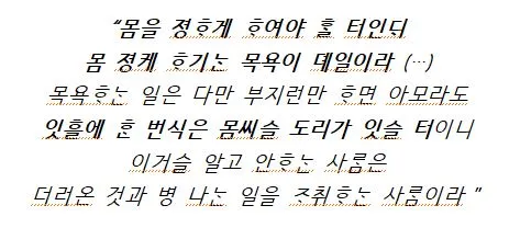 하지만 한국인이 청결을 신경쓰기 않은 것은 아닙니다. 오히려 조선 사람들의 청결은 지켜야 할 유교 도덕 중 하나였는데요. 헝클어진 머리, 때 낀 얼굴에 옷과 허리띠를 아무렇게나 몸에 걸치는 것은 “검소한 것이 아니라 누추”한 것이라고 칭하며, 자녀가 올바른 차림을 할 수 있도록 가르치는 부모의 교육도 중요했습니다. 이는 조선이 유교적 차원의 청결을 추구하였다고 볼 수 있습니다.