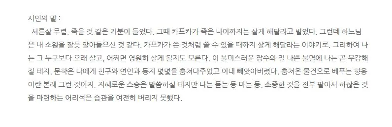 진은영 시인이 시집 "훔쳐가는 노래"에 시인의 말로 적은 문장이다. 아직 이 시집을 읽어보지 못해 검색으로 찾아봤다.