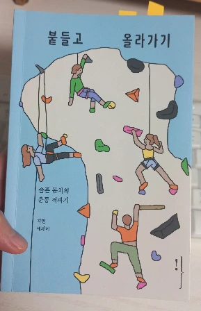 아무튼 회장이 된 준가님은 얼마 뒤 회원들끼리 나눔 활동을 해보자고 제안했다. 준가님이 내놓은 물건은 책이었다. 나는 분위기도 띄우고(응?), 서로 갖겠다며 가위바위보하는 분위기도 만들고 싶어서 이것저것 달라고 했다. 그런데 예상과 달리 책 욕심 내는 사람이 없어서 무안하게도 책 두 권이 내게로 왔다. 그중 한 권이 이 책 "붙들고 올라가기"다. 책의 부제는 '슬픈 몸치의 운동 격파기' 운동과 거리가 멀던 사람이 운동을 '시도'하고 즐거움을 알아가는 과정을 적은 에세이다. 작가는 클라이밍과 야구를 한다.