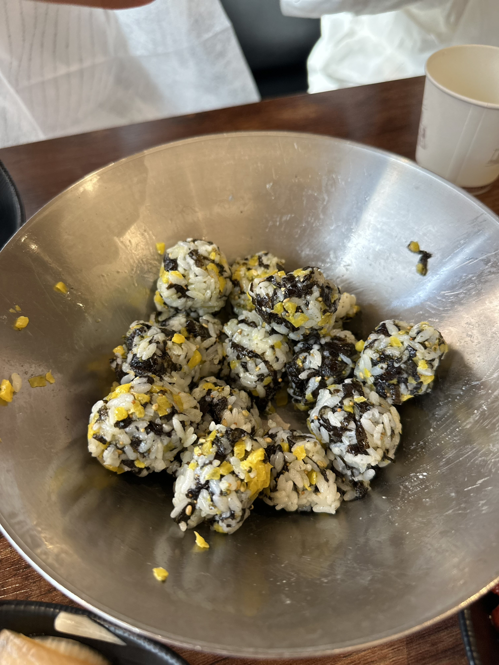 마지막이라는 아쉬움에 친하게 지내던 몇몇 동료들과 저녁을 먹으러 갔어요. 하필이면 야근할 때 자주 시켜 먹던 주먹밥을 왜 시켜버렸을까요.. 퇴사하는 동료가 매번 비닐장갑을 끼고 동글동글 한 입 쏙 들어가는 크기로 만들어주던 순간이 더 생각나 버리게 말입니다.