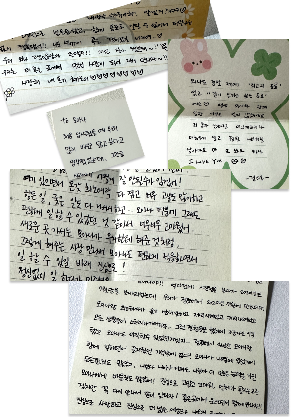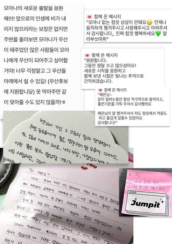 스스로 괜찮은 첫 회사생활을 했다고 칭찬하고 있었지만, 함께 일했던 동료들이 퇴사인사로 건네주는 한마디들이 '내가 더 괜찮은 사람이었구나'하고 느껴지며 인정받는 느낌이 들었어요. 이런 마음들을 잘 담아두고자 브런치에도 남겨봐야겠습니다.