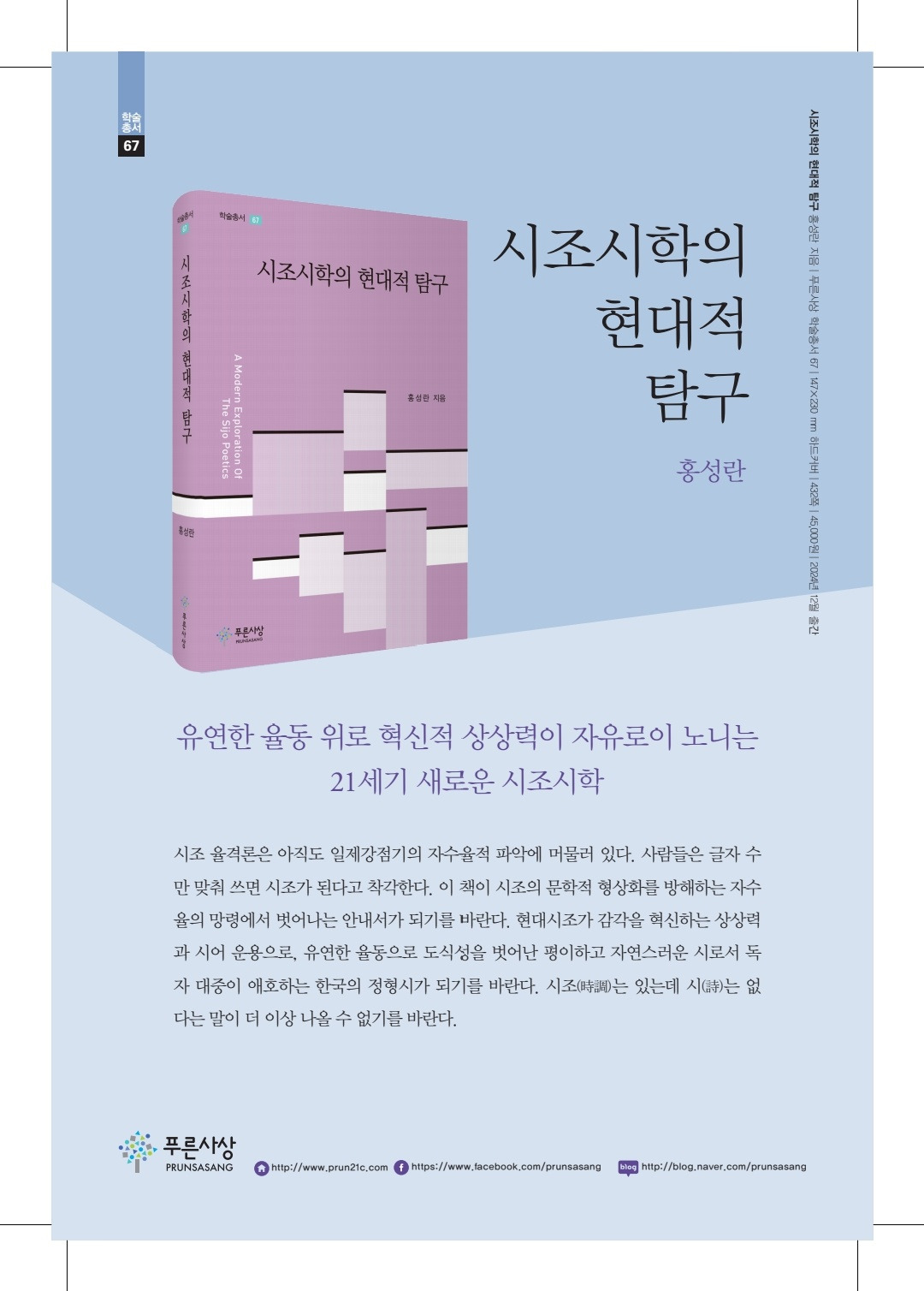 이 책은 지난 삼십년간 창작자로서, 연구자로서 고뇌해 온 산물이다. 아직도 시조 율격론은 일제강점기의 자수율적 파악에 머물러 있다. 일각에는 ‘초장 3·4·4(3)·4, 중장 3·4·4(3)·4, 종장 3·5·4·3’이라는 거푸집(型)에 넣듯 글자 수를 맞추어 써야 한다는 오해가 있다. 정말 글자 수만 맞춰 쓰면 되는가. 도대체 시상詩想을 자유롭게 펼칠 수는 있는가. 그러다보니, 시조時調는 있는데 시詩는 없다는 비아냥을 듣기도 한다.