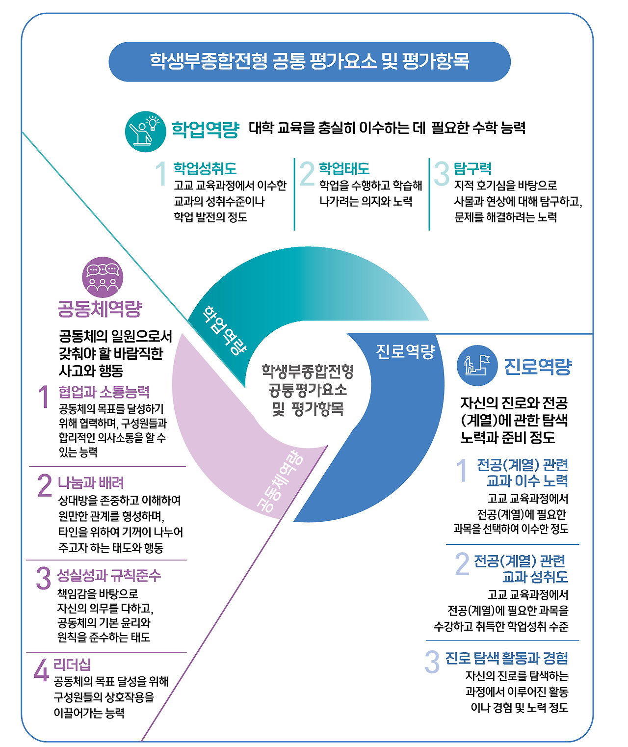 우선 내가 희망하는 대학교 학종에서 어떤 요소와 항목을 기준으로 평가하는지 확인하는 게 중요하다. 대학교마다 약간의 차이가 있지만, 「학생부종합전형 공통 평가요소 및 평가항목」(2021년 건국대·경희대·연세대·중앙대·한국외대 공동연구)에서 제시하는 평가 요소와 항목을 준비하면 학종을 일반화하여 준비할 수 있다. 공동연구에서는 3가지 평가요소인 학업역량, 진로역량, 공동체역량을 제시하고 있으며, 또한 각 요소별 평가 항목을 아래와 같이 제시하고 있다.