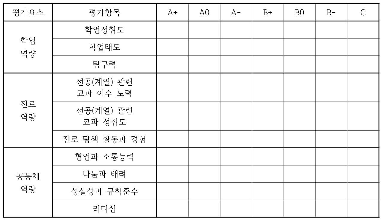 보통 학종 평가에서는 위에 제시된 평가요소별 평가항목을 충족하면 좋은 점수를 받게 된다. 그렇다면 입학사정관들이 어떤 기준을 가지고 평가요소별 평가항목에 점수를 부여하는지 추정할 수 있다면, 우리가 학종을 준비하는데 도움이 되지 않을까? 이를 아래 평가도구를 활용하여 설명해보고자 한다.